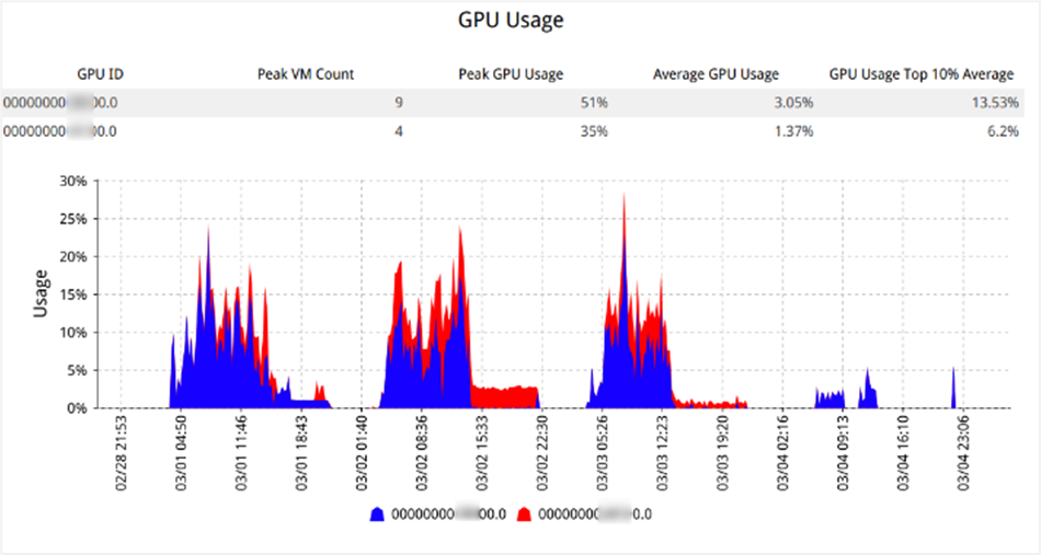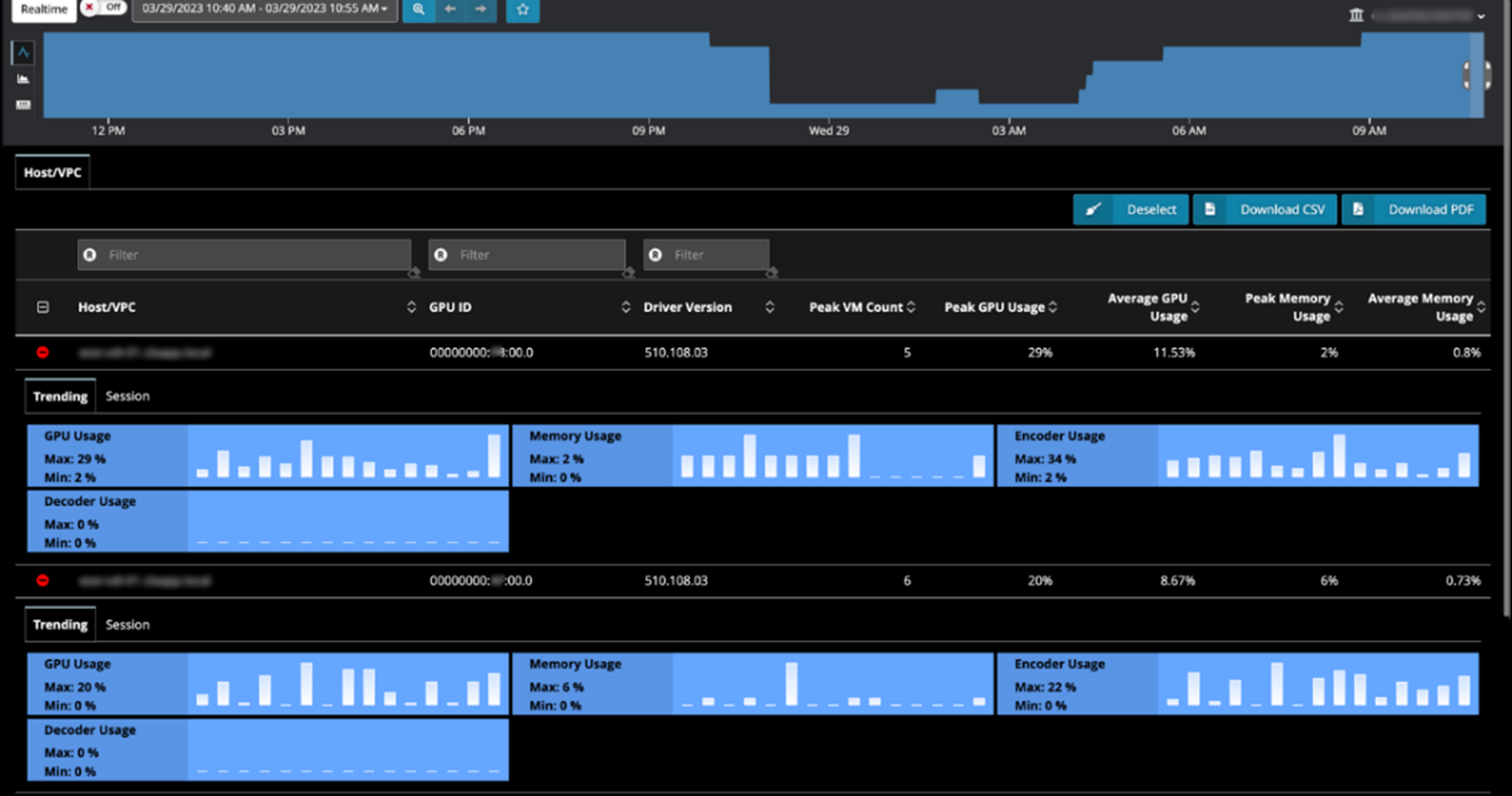 NVIDIA System Management Interface (nvidia-smi/NVSMI) を使用してNVIDIA GPUメトリクスを表示できるようになりました。GPUモニタリング機能により、個々のユーザーセッションの VMレベルのピーク GPU使用量、フレームバッファ、GPUデコーダ/エンコーダ使用量、メモリ使用量などの重要なGPUについての洞察を得ることができます。また、GPU ID、ドライババージョン、GPUを使用するユーザーセッション数、フレームバッファ、GPUデコーダ/エンコーダ、ピーク/平均GPUおよびメモリ使用量などのホストレベルのトレンドメトリクスを提供します。