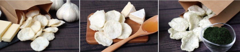 お米としろえびの旨味と甘味がギュッと詰まった揚げせんべい、ガーリックバター醤油・ハニーチーズ・青のりの3種類のフレーバーが揃っています。