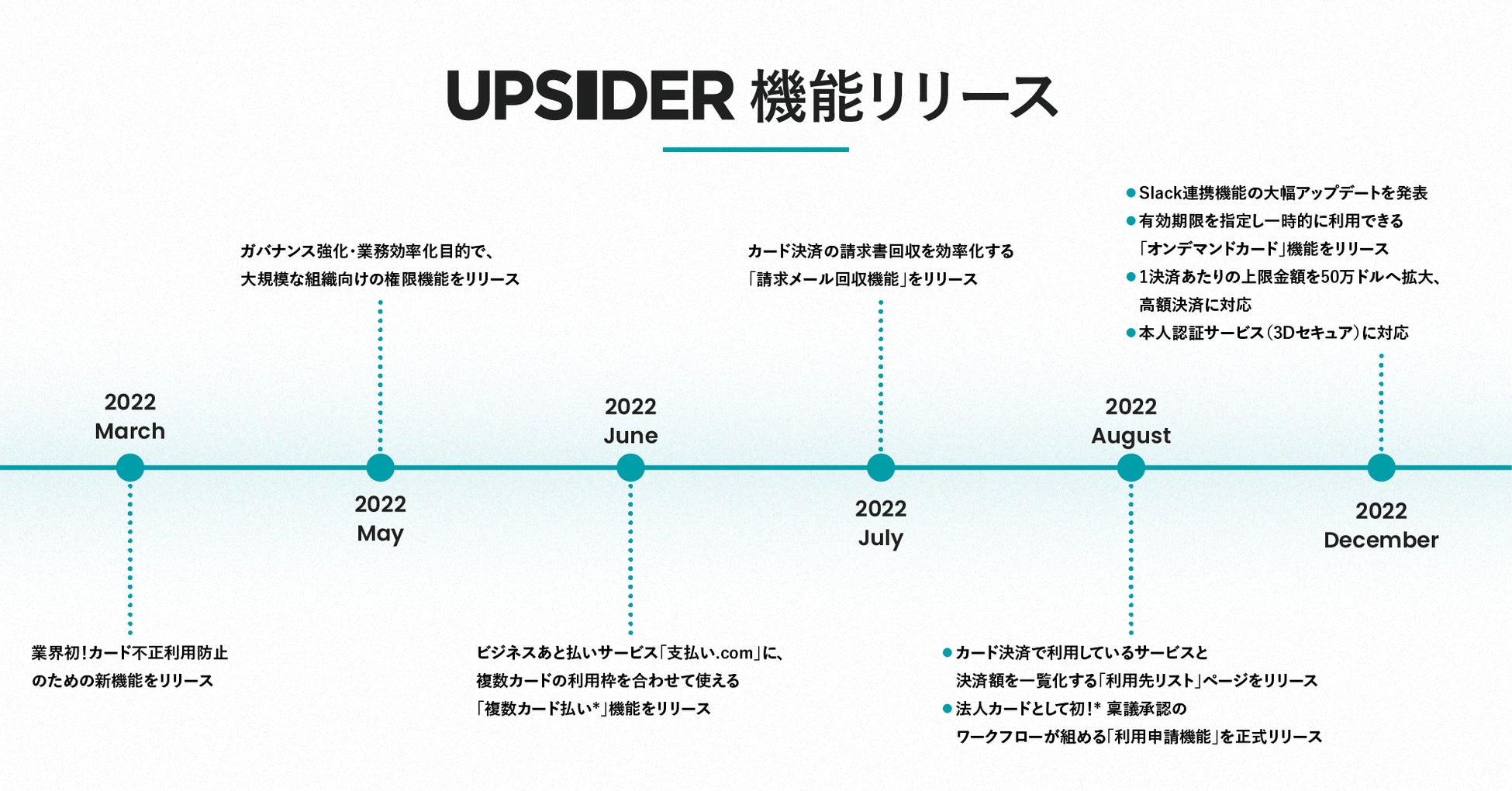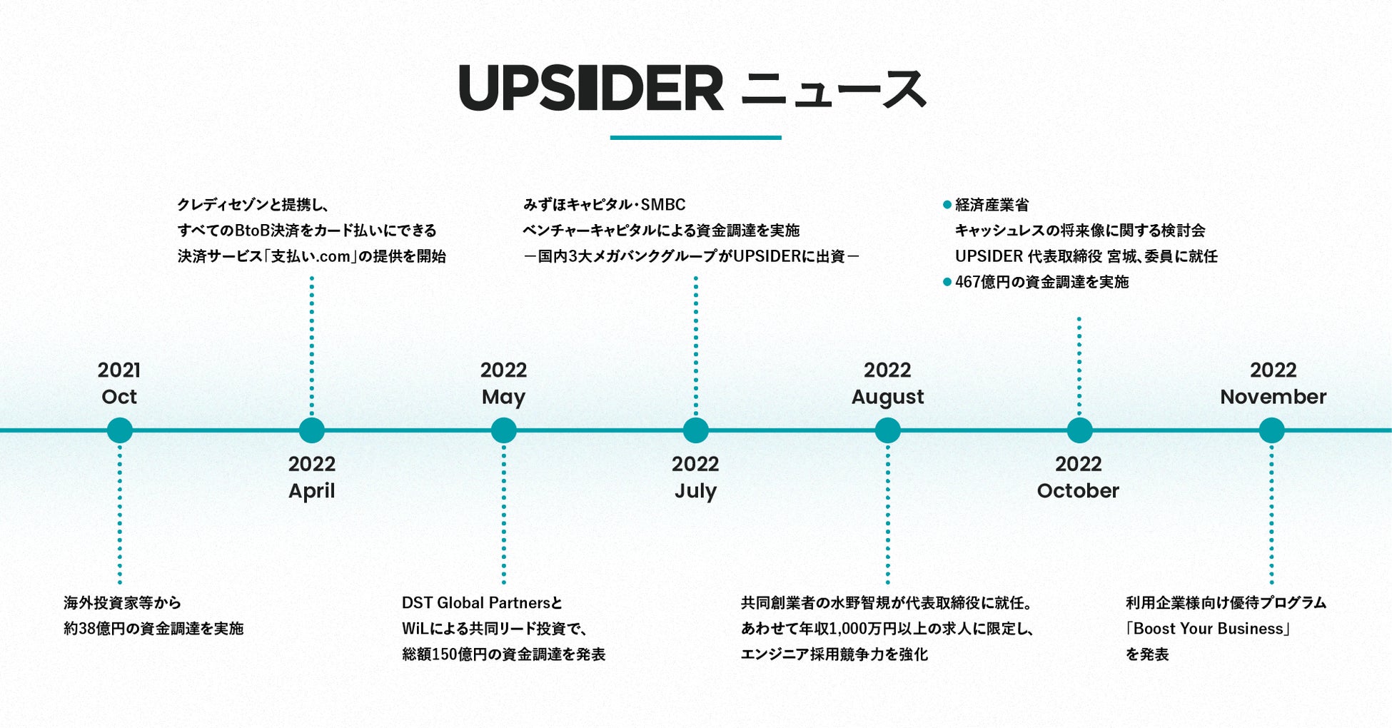 今回のインフォグラフィックスは、「挑戦する人々がより活躍できる社会を創る」をミッションに、法人カード「UPSIDER」およびビジネスあと払いサービス「支払い.com」を提供し、ユーザーの皆様と共に成長してきた当社のあゆみを、感謝を込めて公開いたしました。