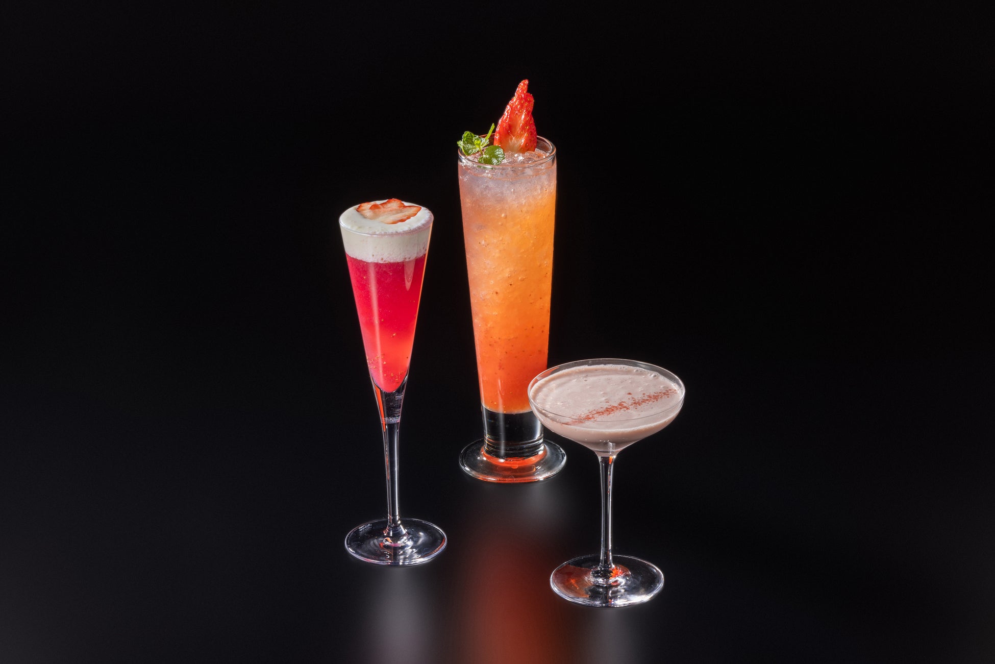 中国料理や日本料理など、コース料理のデザートやブッフェメニューもいちご&チョコレート仕様に。メインバーにもいちごのカクテルが登場します。