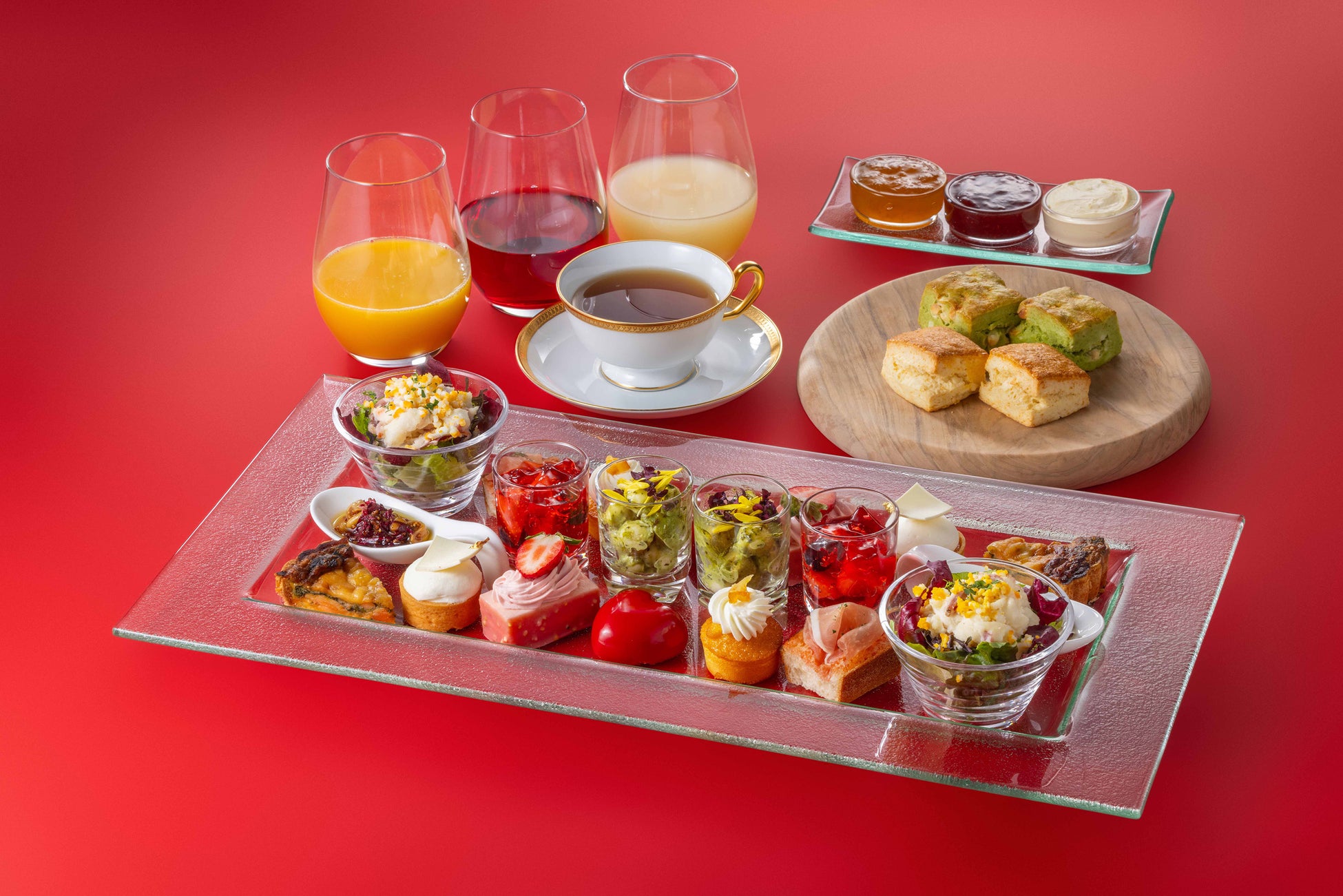 真っ赤なグラッサージュに包まれたルビーチョコやロールケーキなど、ショコラスイーツを華やかに織り交ぜたアフタヌーンティー。合鴨とオレンジのテリーヌや照り焼きチキンと玉子のパニーニなど、セイボリーもお楽しみいただけます。