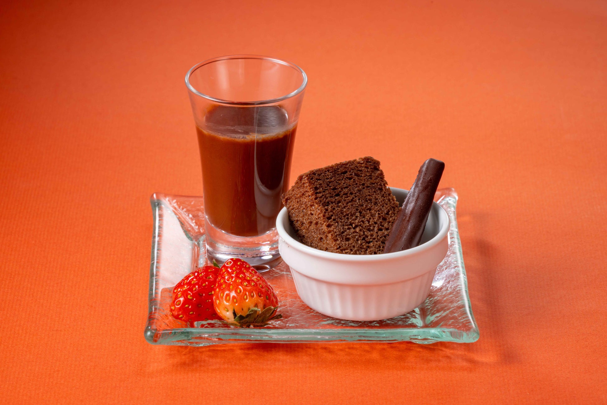 ココナッツ風味のチョコドリンク、チョコレート風味の中国風蒸しカステラ「マーラーカオ」、いちご。