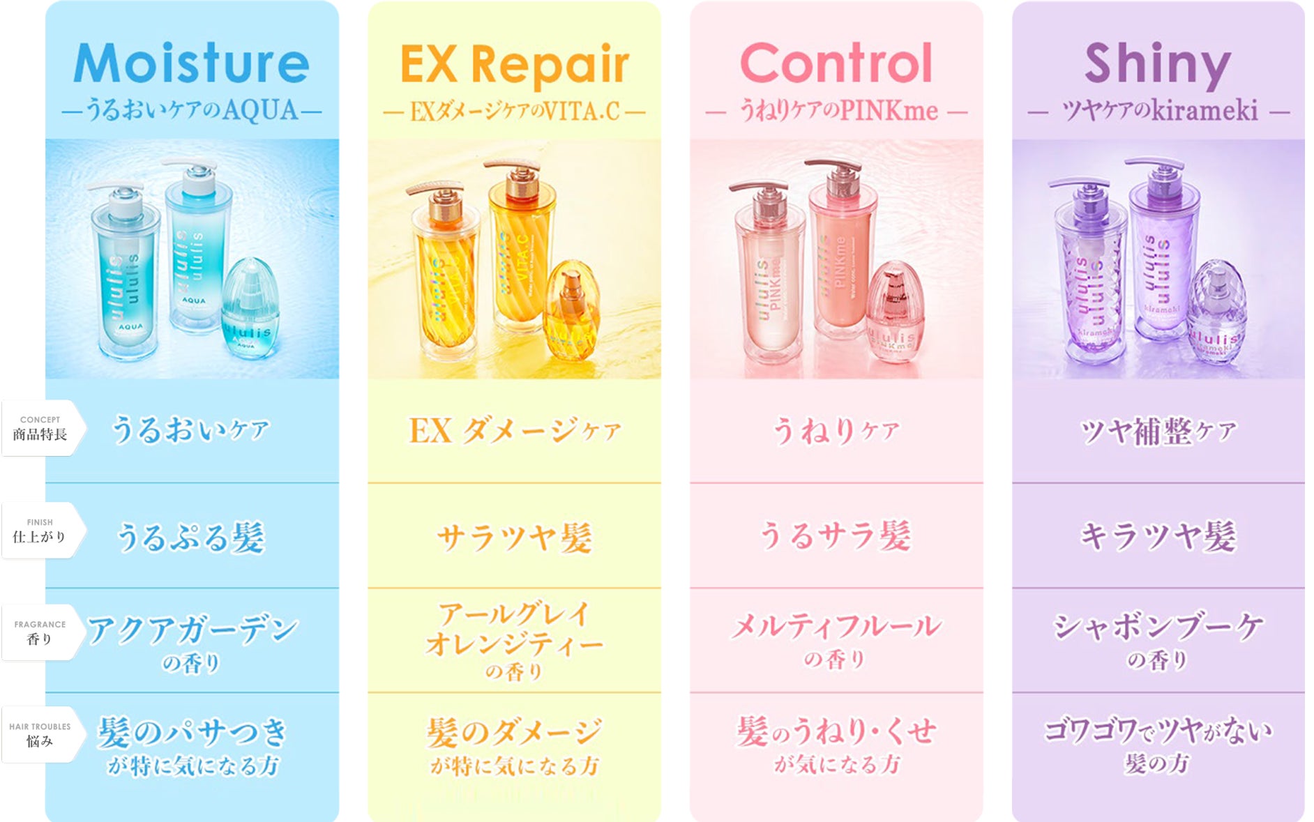 「うるおいケアのAQUA(アクア)」、「EXダメージケアのVITA.C(ビタシー)」、 「うねりケアのPINKme(ピンクミー)」、「ツヤ補整ケアの kirameki(キラメキ)」の4シリーズ展開。