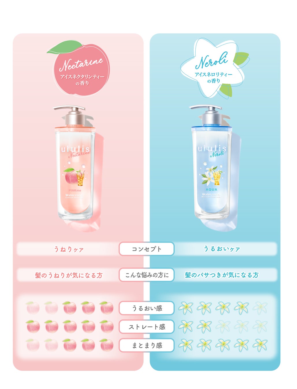 今回発売となる夏限定商品は「ウルリス ネクタリンティー ピンクミー」、「ウルリス ネロリティー アクア」の2種類展開。「ウルリス ネクタリンティー ピンクミー」は、髪のうねりやくせが気になる方におすすめのシリーズで、みずみずしいネクタリンとアイスティーをイメージした、ほんのり甘くフルーティーな「アイスネクタリンティー」の香りとなっております。