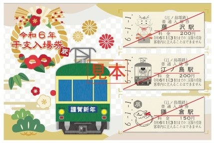江ノ島電鉄株式会社(神奈川県藤沢市、社長 楢井 進)では、2024年1月1日(月祝)より「令和6年干支入場券(辰)」を数量限定で発売いたします。正月らしい縁起の良い特製台紙に、来年の干支である『辰』のイラストが入った硬券入場券がセットされています。新年の始まりに、初詣の記念に、ぜひご購入いただければ幸いです。