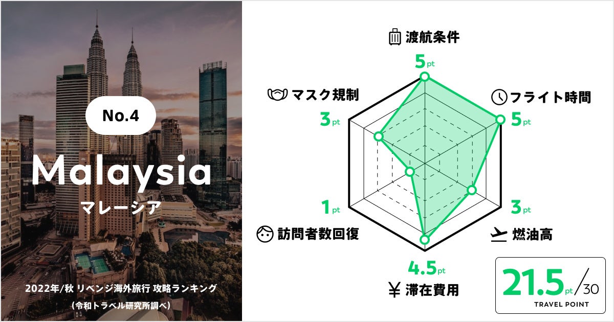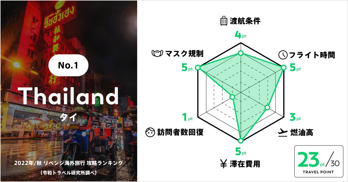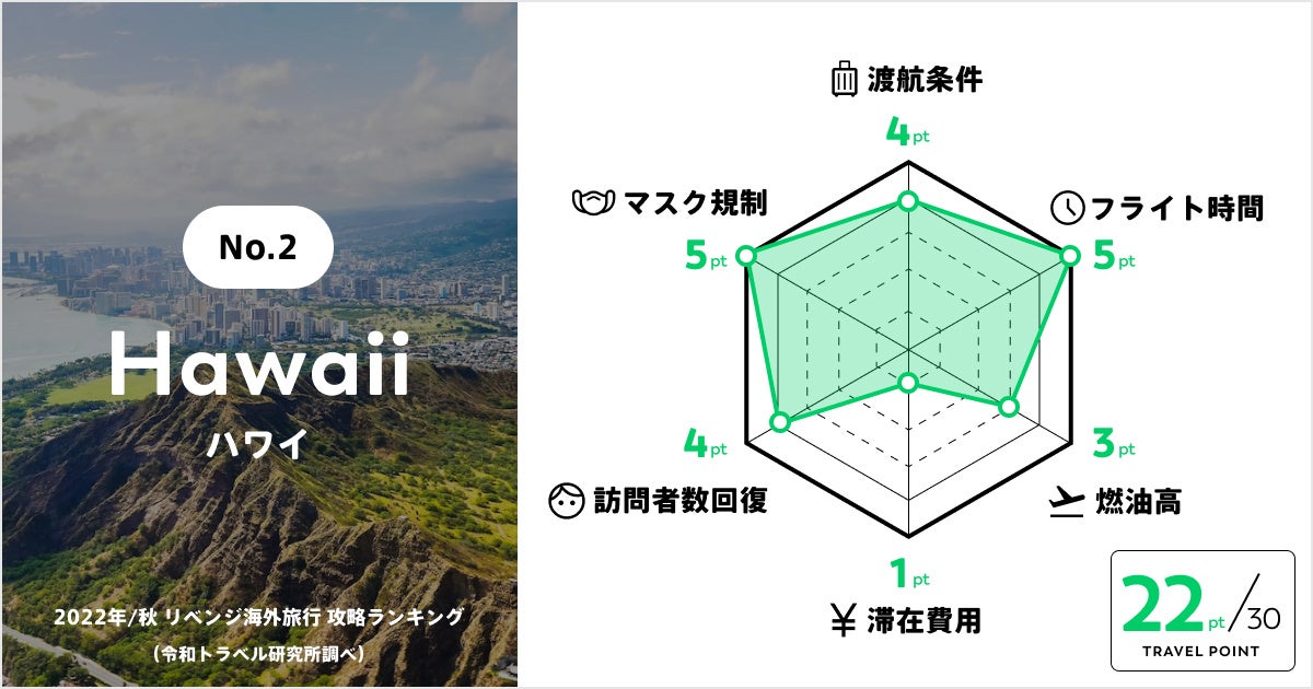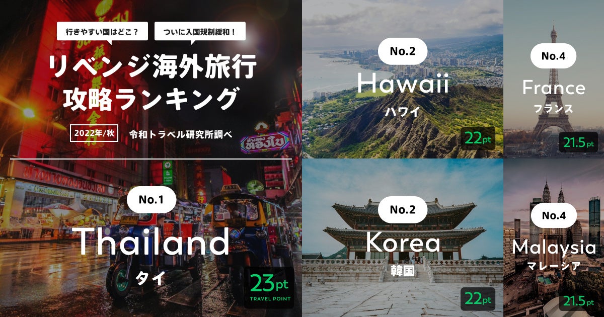 「あたらしい旅行を、デザインする。」をミッションにする株式会社令和トラベル(本社:東京都渋谷区、代表取締役社長:篠塚 孝哉)の調査研究機関 令和トラベル研究所は、9月7日より日本の入国規制が緩和されることを受け、最新情報を盛り込んだ「リベンジ海外旅行 攻略ランキング」を新たに発表いたしました。