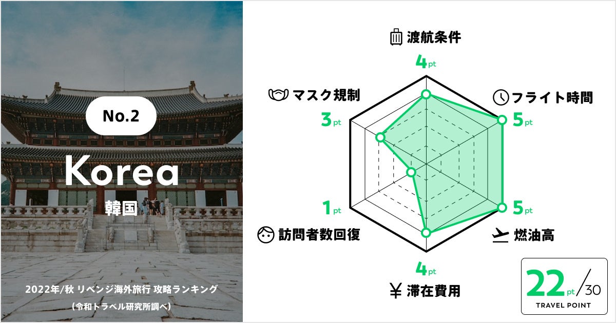 ◆観光ビザの不要&入国時PCR検査不要が発表された韓国も同率第2位に。