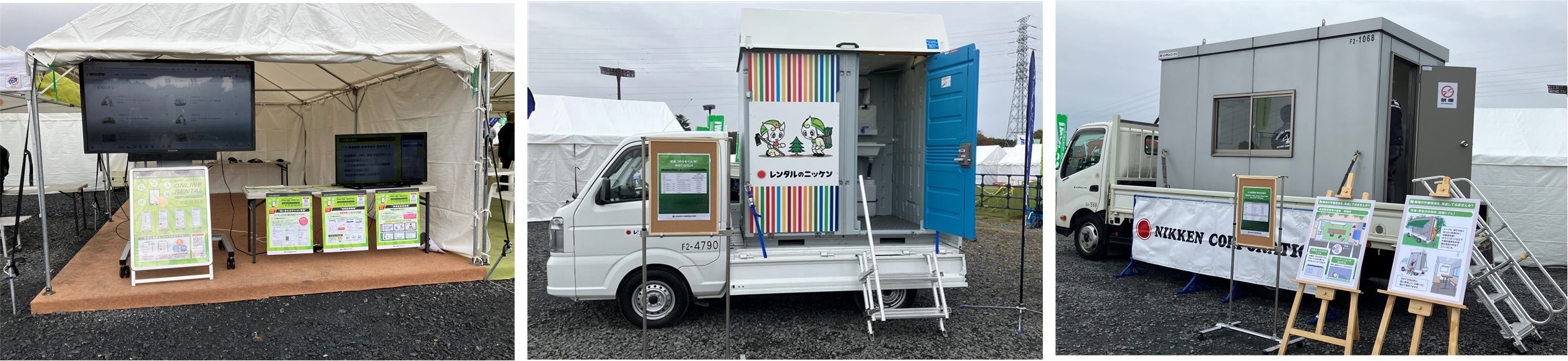 業務効率化としては、オンラインレンタルの紹介ブースを設け、DXの推進で林業を効率化することを目的に、お客様に新たなご提案を行いました。また、現場の職場環境改善として、車載トイレや移動式休憩所などの展示も行い、展示商品に見て・触れていただき実際の広さや使用感などを確認いただきました。