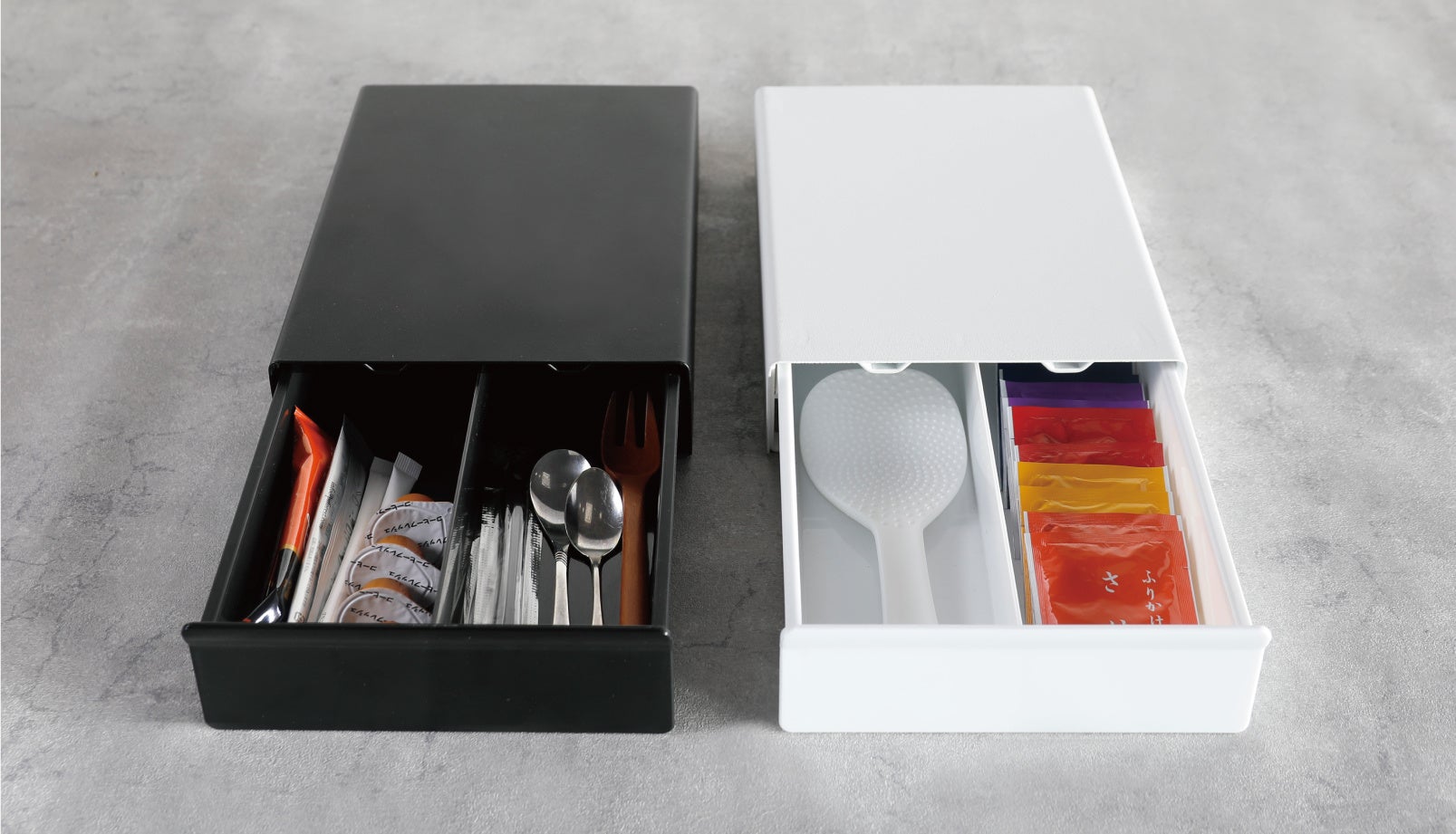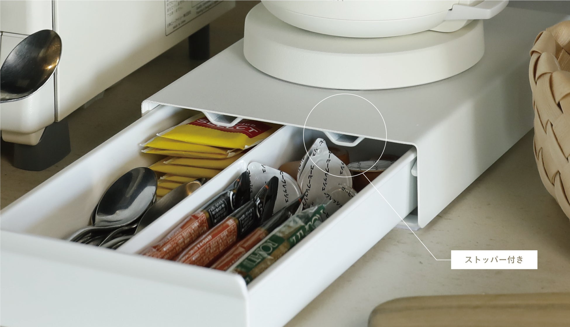 例えば、電気ケトルを上に載せ、スティックシュガーやティーバッグ、ティースプーンなどの小物をスッキリ収納することが出来ます。置き場に困る小物や家電も、まとめて収納出来るので、「キッチンの散らかり」が減り、「キッチンのお掃除」もとても楽になります。