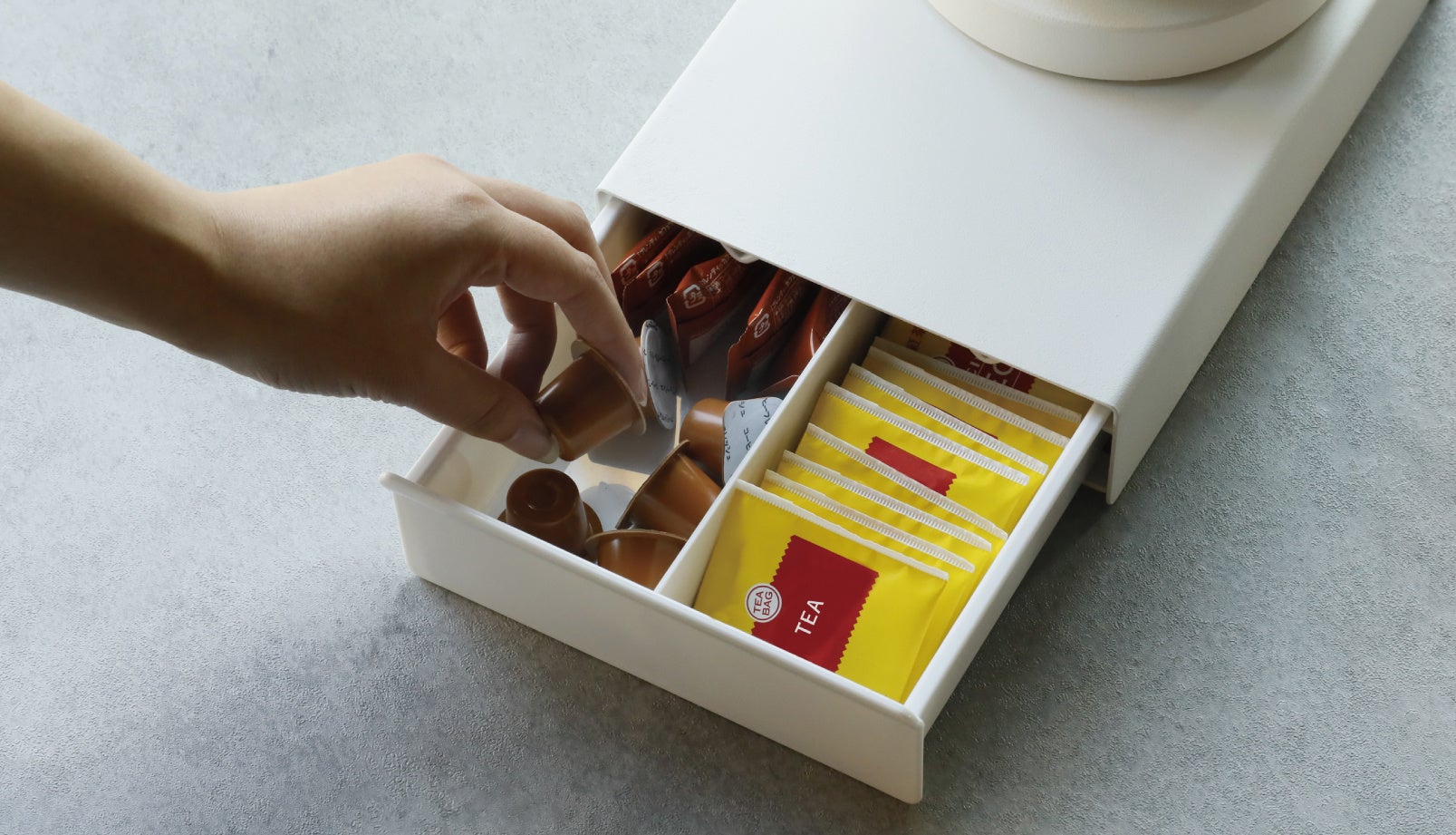 例えば、「紅茶を飲みたい!」と思ったときも、引き出しにしまっておいたティーバッグをさっと取り出し、本体の上に載せている電気ケトルを使えば、そのまますぐにお湯を注いで使うことも可能です。
