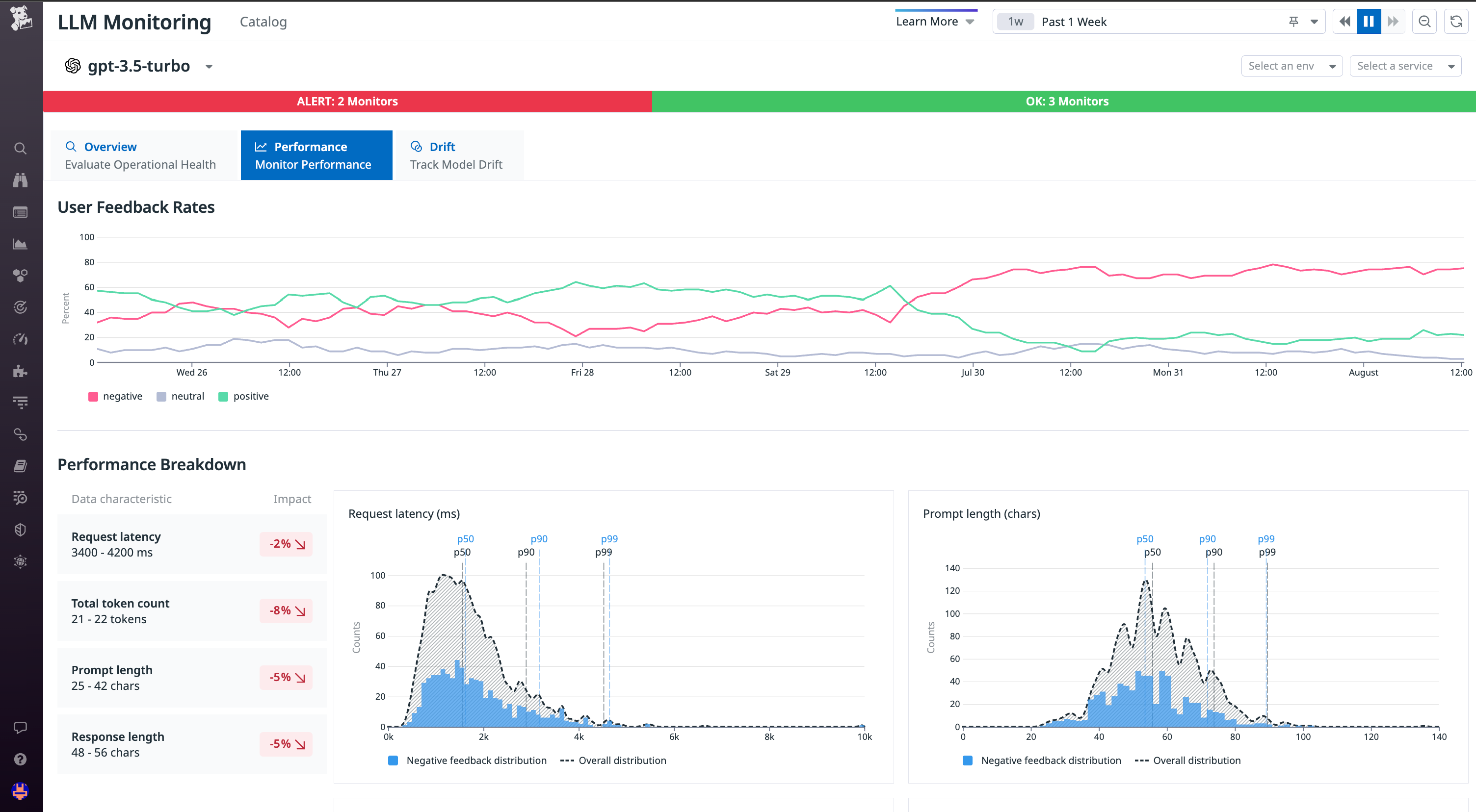 - モデルパフォーマンス:プロンプトとレスポンスの長さ、APIレイテンシー、トークン数など、すぐに提供されるさまざまなデータの特性に基づいて、モデルのパフォーマンスの問題を特定します。