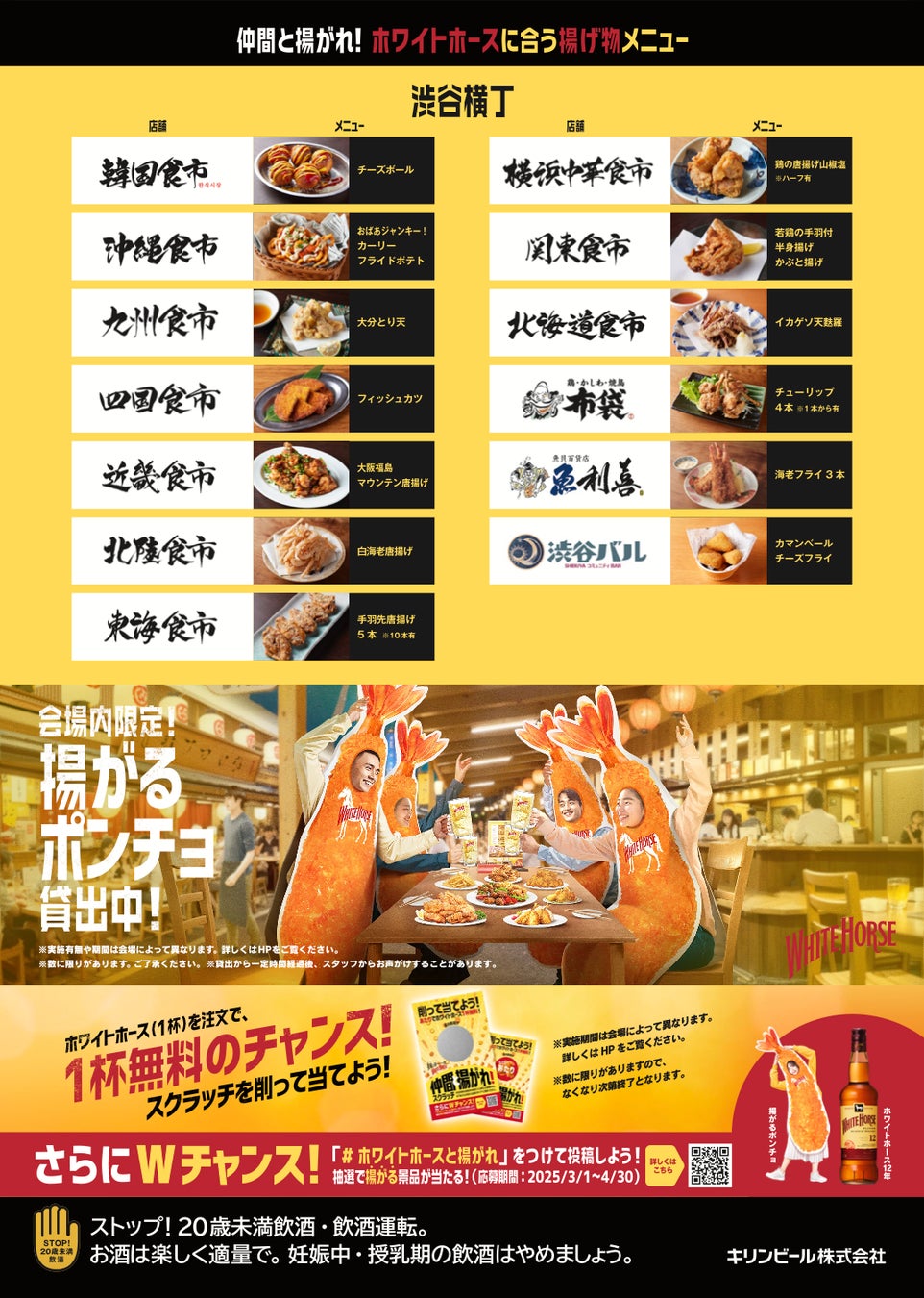 「ホワイトホース」と揚げ物の絶妙なペアリングが楽しめる「仲間と揚がれ!」キャンペーンを、2025年3月5日(水)から4月30日(水)まで全国11カ所の横丁で順次開催いたします。期間中は、各地域ならではの厳選された揚げ物と「ホワイトホース」のペアリングをお楽しみいただけます。各横丁では「揚がるポンチョ」をご用意し、「ホワイトホース」の装飾とともにユニークな体験をお楽しみいただける空間をご提供します。