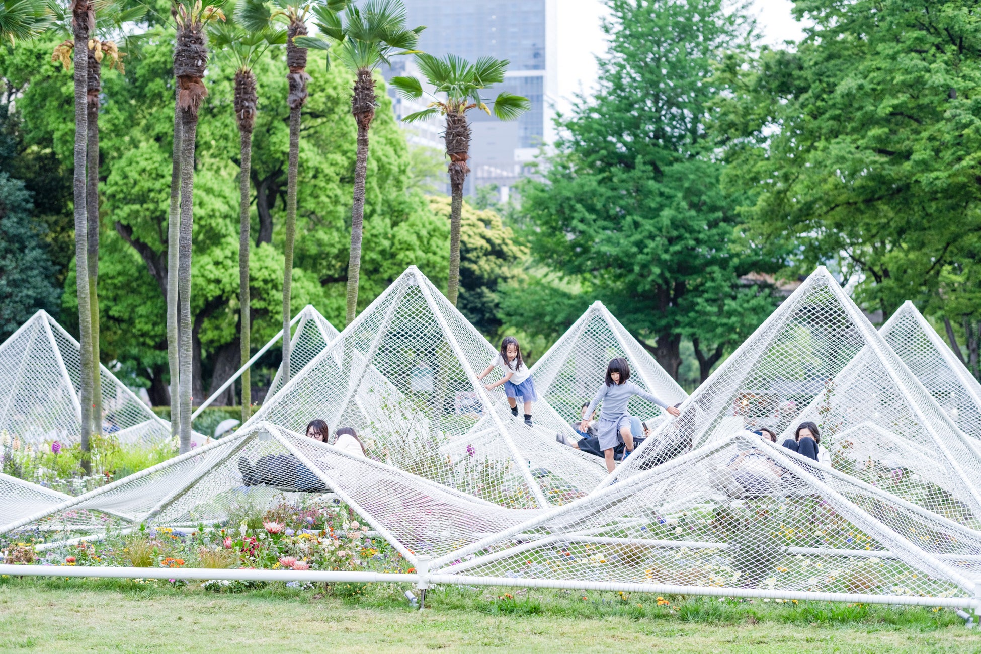 廃棄予定だった漁網を回収し、アップサイクルした糸から作られています。四方を海に囲まれた日本において海洋ゴミによる海洋汚染や生態系への影響は深刻な問題です。本作は、あそびを通じてそうした環境問題に触れることができるインスタレーションです。期間中は夜間にライトアップを実施し、昼間とは異なる表情もお楽しみいただけます。これまでにも東京ミッドタウン、大阪・さくら広場、日比谷公園などで期間限定で設置され、今後もさまざまな場所での展開が予定されております。自然の光や風を感じ、私たちの暮らしと自然環境とのつながりに意識を巡らせるきっかけとなることを願っています。