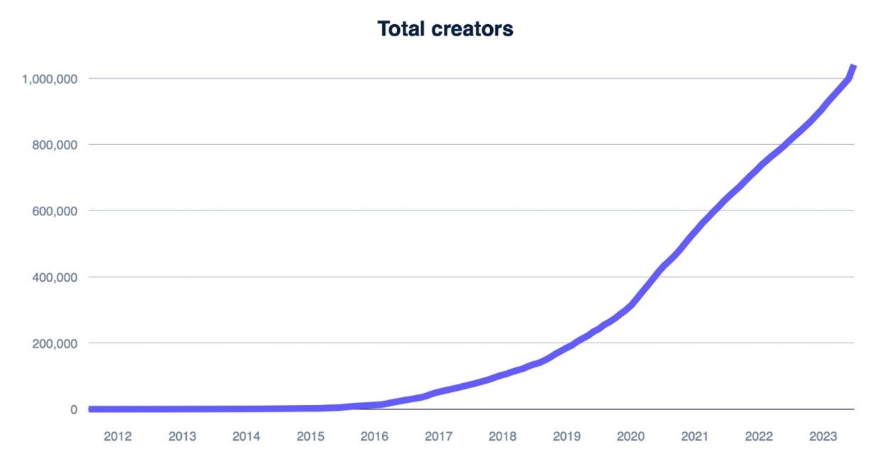 しかし、2021 年の Stripe の集計データによると、その当時クリエイター・プラットフォームは 66 万 8000 人のクリエイターを取り込み、100 億米ドルの支払いを受け取っていたことが分かりました。2023 年のデータが示す 100 万人以上のクリエイター数、250 億ドル以上の収益と比較すると、クリエイターエコノミーが 2021 年当時と変わらず急成長している証拠と考えられます。