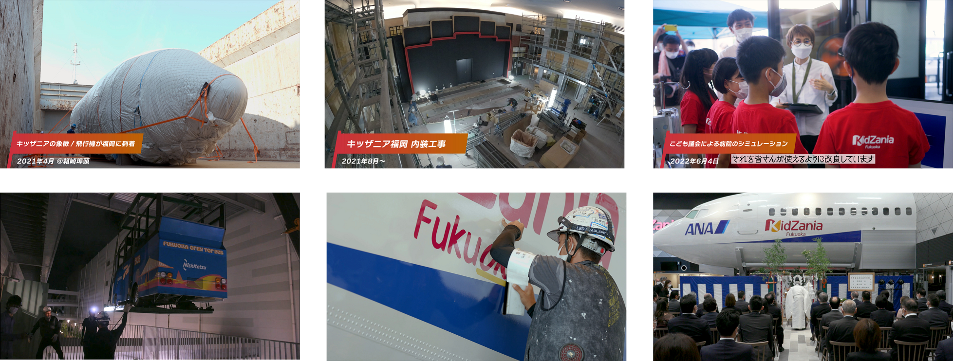 本動画は、2021年4月にキッザニアの象徴である飛行機機体が福岡県の箱崎埠頭に到着した日から、2022年7月31日のグランドオープンまでの478日間の記録をまとめたもので、飛行機の塗装風景やキッザニアの街ができるまでの工事風景、「こども議会」(※)のメンバーによるアクティビティのシミュレーションなど、「キッザニア福岡」がオープンするまでのさまざまな裏側の一部を見ることができます。また、報道関係者向けに公開した飛行機の機体搬入シーンや施設概要の記者発表会、こども達の職業体験に欠かせない「消防車」などの車両の吊り上げ搬入、開業前日の内覧会、オープン当日の様子などもあり、特に車両搬入に関しては、非公開エリアからの撮影映像も含まれています。