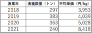2019年をピークに漁獲量は減少傾向に。昨年は、漁獲量前年比約3割減となり、平均単価は2018年時の2.1倍となりました。