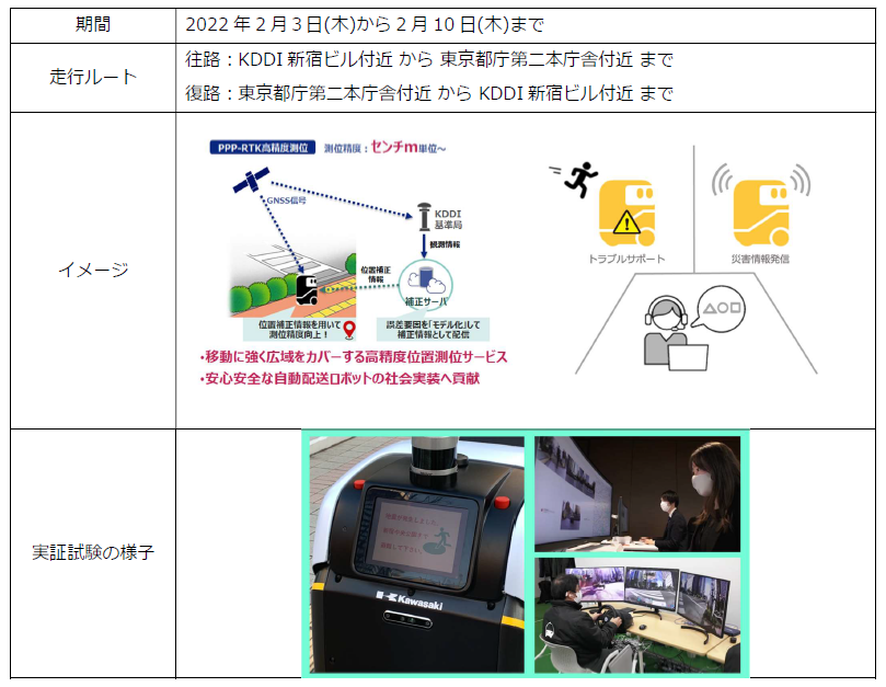 株式会社ティアフォー(本社: 愛知県名古屋市、代表取締役社長: 武田 一哉、以下「ティアフォー」)、川崎重工業株式会社(本社: 東京都港区、代表取締役社長執行役員: 橋本 康彦、以下「川崎重工」)、KDDI株式会社(本社: 東京都千代田区、代表取締役社長: 髙橋 誠、以下「KDDI」)、損害保険ジャパン株式会社(本社: 東京都新宿区、代表取締役社長: 西澤 敬二、以下「損保ジャパン」)、小田急電鉄株式会社(本社: 東京都新宿区、取締役社長: 星野 晃司、以下「小田急電鉄」)、株式会社ホテル小田急(ハイアット リージェンシー 東京)(本社: 東京都新宿区、代表取締役社長: 小柳 淳、以下「ホテル小田急」)、一般財団法人公園財団(本社: 東京都文京区、理事長: 蓑茂 壽太郎、以下「公園財団」)の7つの企業・団体は、2022年1月22日から2022年2月10日まで、西新宿エリアにて、自動配送ロボットが5Gを活用して公道を走行しラストワンマイルの配送を行う実証実験(以下、「本実証実験」)に国内で初めて*1取り組んでいます。2022年2月3日以降の期間には、将来の自動配送ロボットの社会実装シーンを見据え自動配送ロボットの自律走行を遠隔地で監視・操作する実証を行うなど、より効率性・可用性が高く安全な配送の実現を目指しています。