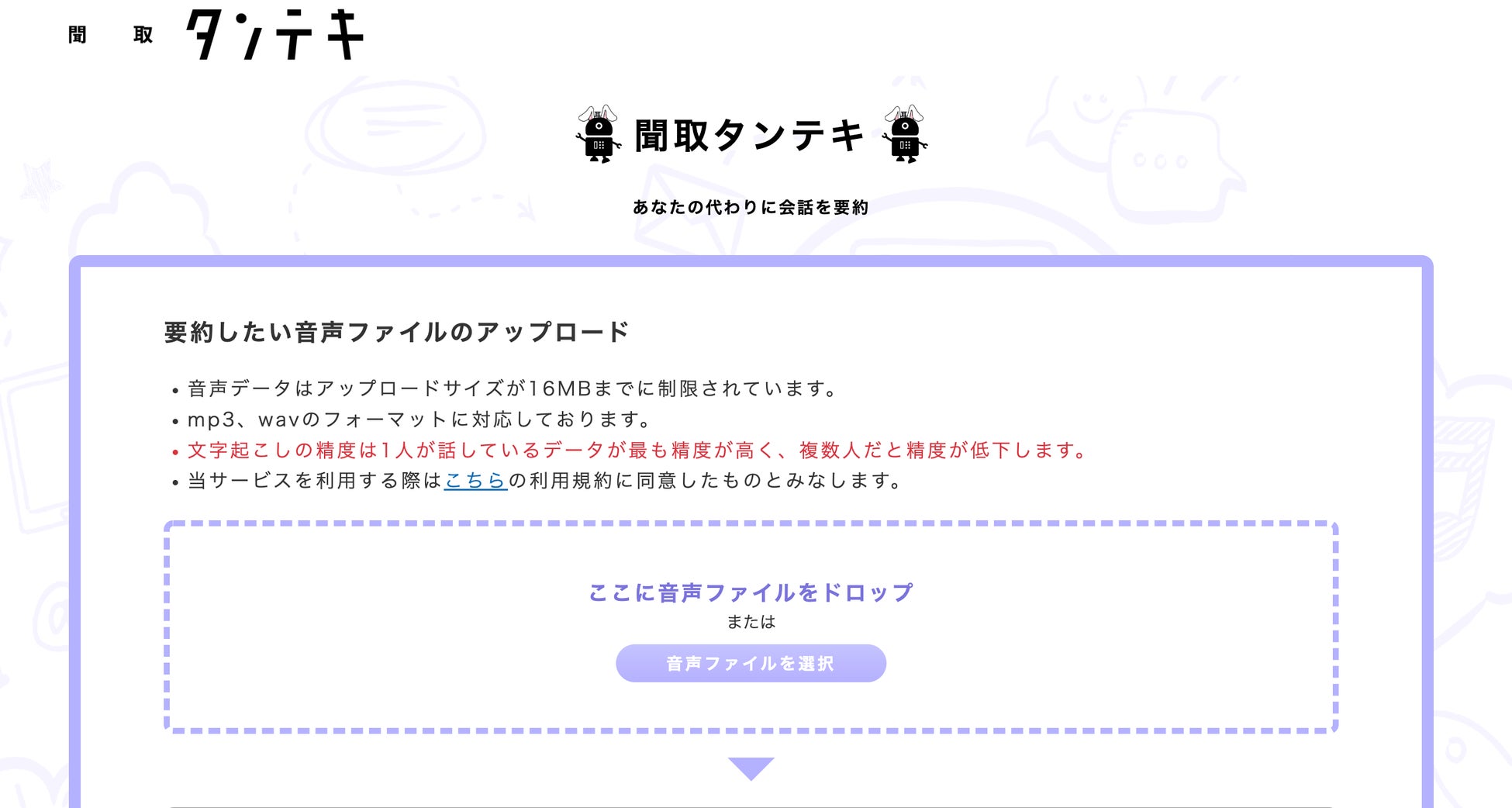 この度リリースされた「聞取タンテキ」は、音声ファイルをサイト内でアップロードするだけで、文字起こしから要約まで一つのページで行うことができるWEBサービスです。
