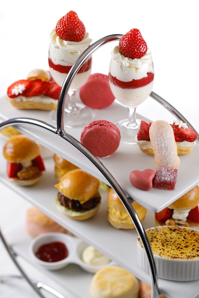 、ハートの苺チョコ、苺とクリームチーズの生ハムバーガー、トリュフバターのエッグバーガー、自家製ハンバーグのチーズバーガー、海老グラタン、スコーン2種(苺・プレーン)と、3種のディップ添え(タプナード・クロテッドクリーム、苺ジャム)、お好きなお飲み物(ティーカクテル・ワイン・ビール・ソフトドリンクの中からお選びいただけます)