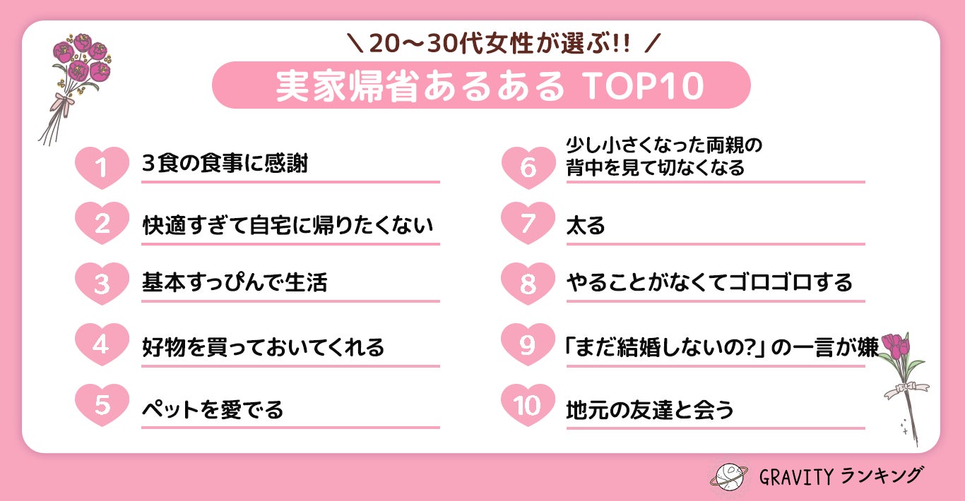 【GRAVITYランキング】20〜30代女性が選ぶ!!「実家帰省あるあるTOP10」