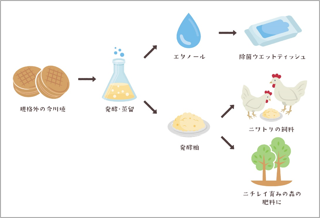 『今川焼(あずきあん)』の規格外品は、ファーメンステーション独自の発酵技術で、皮とあずきあんを分別・前処理することなく一体してエタノール化されます。エタノールは除菌ウエットティッシュに使用され、同時に生成する発酵粕はニワトリの飼料ならびに「ニチレイ育みの森(※)」の肥料へと余すことなく活用されます。
