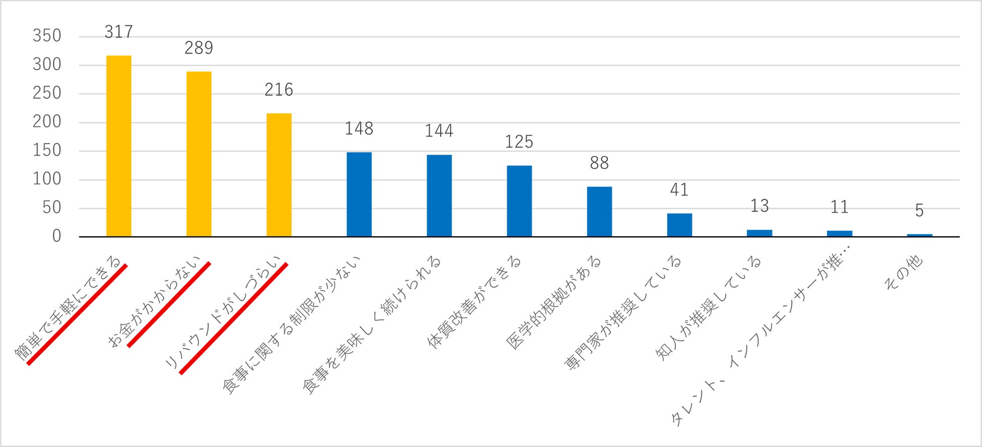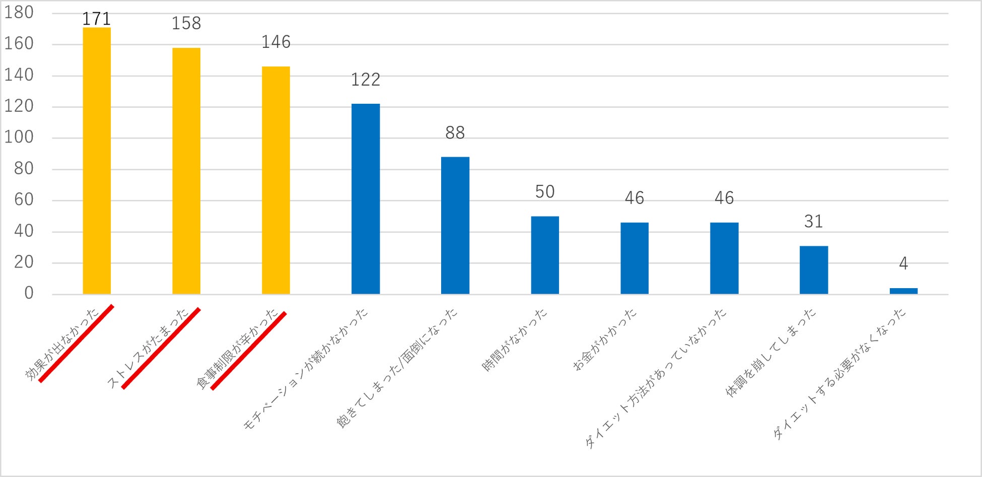 ・ダイエットの失敗・挫折の理由のトップ3は「効果が出なかった(痩せなかった)」「ストレスがたまった」「食事制限が辛かった」。
