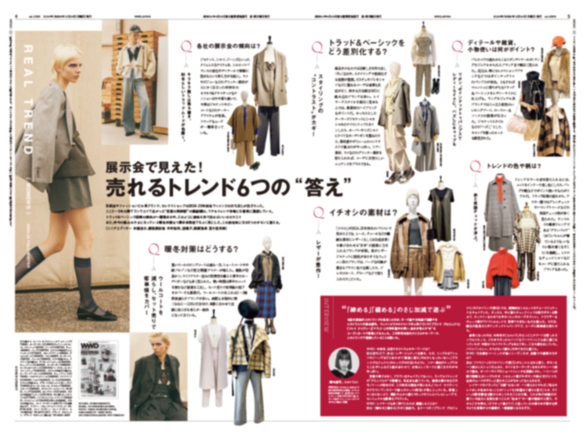 特集冒頭では「トレンドの素材は?」「色や柄は何が売れそう?」「暖冬対策は?」といった6つのギモンに、ウィメンズリアルトレンドをウォッチしてきた特集担当記者がお答え。キーワードやトレンドを整理できたら、総勢34業態のイチオシルックをご紹介。きっとこの秋冬を戦う上でのヒントが見つかるはずです。