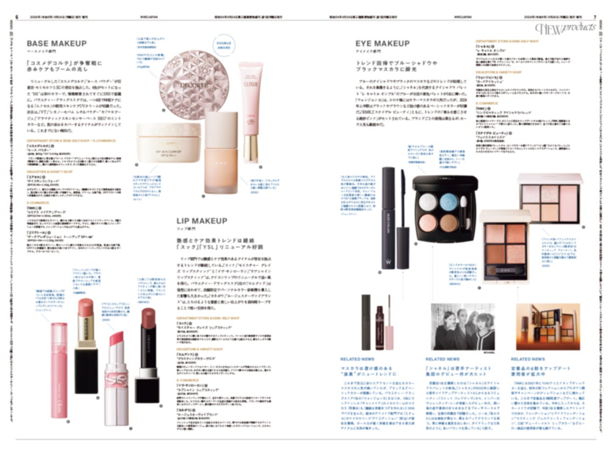 そんな印象的なアイメイク部門をはじめ、「WWDBEAUTYベストコスメ」では、全国の百貨店・セミセルフ、バラエティー・ドラッグストア、ECにアンケート調査を実施し“売れた”アイテムを選出しました。2024年上半期は39店舗の協力の下、1〜4月に発売したニュープロダクト(新商品)とこれまで発売された全商品のヒーロープロダクト(総合)に分け、ベスト3を発表します。表紙を飾ったトリンドル玲奈さんのインタビューも注目の本号を、今期を総括した保存版としてぜひチェックしてみてください。