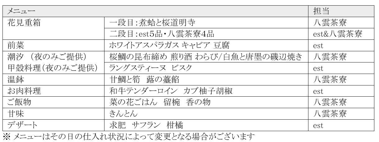 コースには桜の開花に合わせて、2人のシェフによる共同メニュー2段の花見重箱をはじめ、各シェフの技量を感じられる際立ったお料理の数々をご用意いたします。