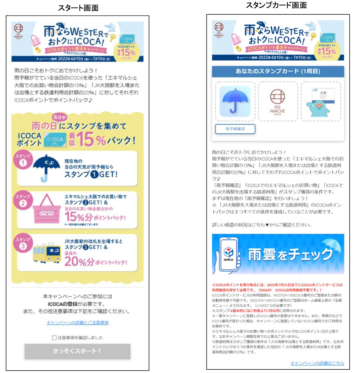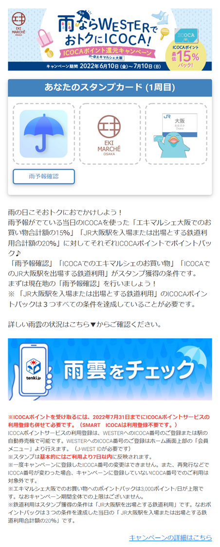日本初!日本気象協会の天気予報と連携したデジタルスタンプラリーを開催!!『雨ならWESTERでおトクにICOCA!~ポイント還元キャンペーン@エキマルシェ大阪~』