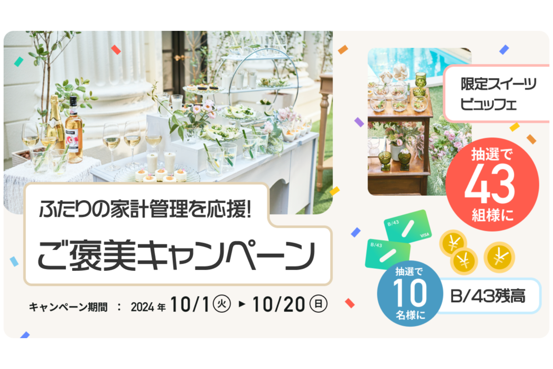家計簿プリカ「B/43(ビーヨンサン)」を提供する株式会社スマートバンク(本社:東京都品川区、代表取締役:堀井 翔太、以下「スマートバンク」)は、婚礼大手の株式会社テイクアンドギヴ・ニーズ(本社:東京都品川区、代表取締役社長:岩瀬 賢治、以下「T&G」)と共同で、夫婦やカップルで使える「B/43 ペアカード」をご利用いただいた方を対象に、抽選で43組様をスイーツビュッフェイベントにご招待する「ふたりの家計管理を応援!ご褒美キャンペーン!」を実施いたします。