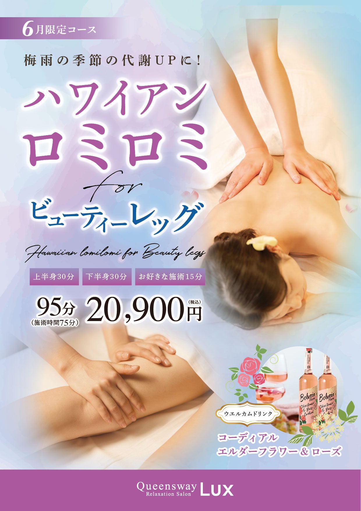 ロミロミ95分forビューティレッグ(施術75分)20,900円。