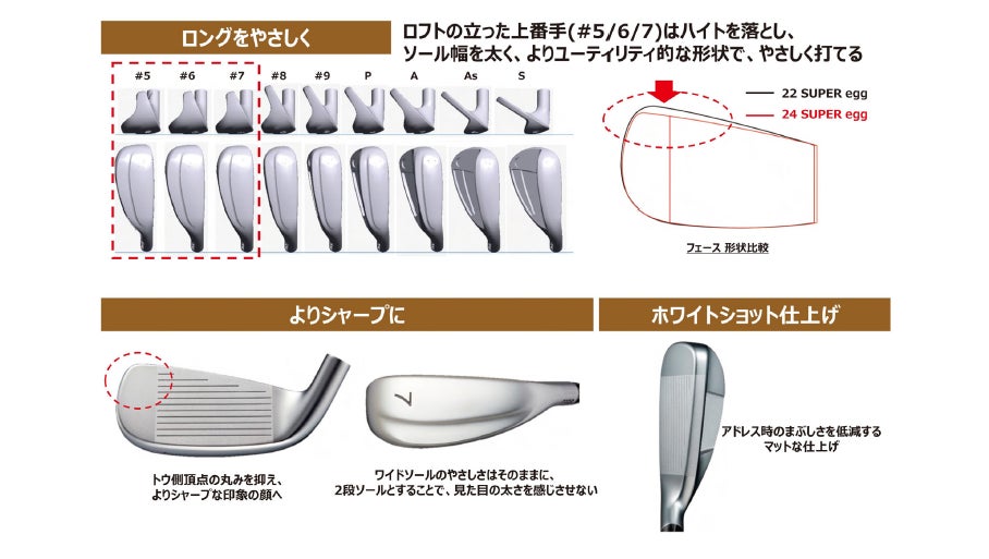 「SUPER egg evolutionアイアン」は、高強度マレージングフェースと中空構造の採用でフェース周辺部の薄肉化が可能となり、アイアンでもSLEルールを超える高反発を実現したのに加え、ストロングロフト設計で飛距離性能を徹底的に追求しました。同時に大きなFP値とワイドソールとすることでストロングロフトでもやさしく上がる設計としています。特にロフトの小さい#5-7では、ソール幅を太く、トウ側ハイトを落としたユーティリティー的な形状とすることで、打ち込まなくてもやさしく上がるアイアンに仕上げています。また、見た目はシャープな印象になるようフェースのトウ側頂点の丸みを抑えつつ、ソールは2段ソールにして太さを感じないよう工夫したほか「ホワイトショット仕上げ」でアドレス時のまぶしさを低減させています。このほか、As、Sはルール適合外の「角溝スコアライン」を採用したことにより、ラフからも高いスピン性能を発揮します。