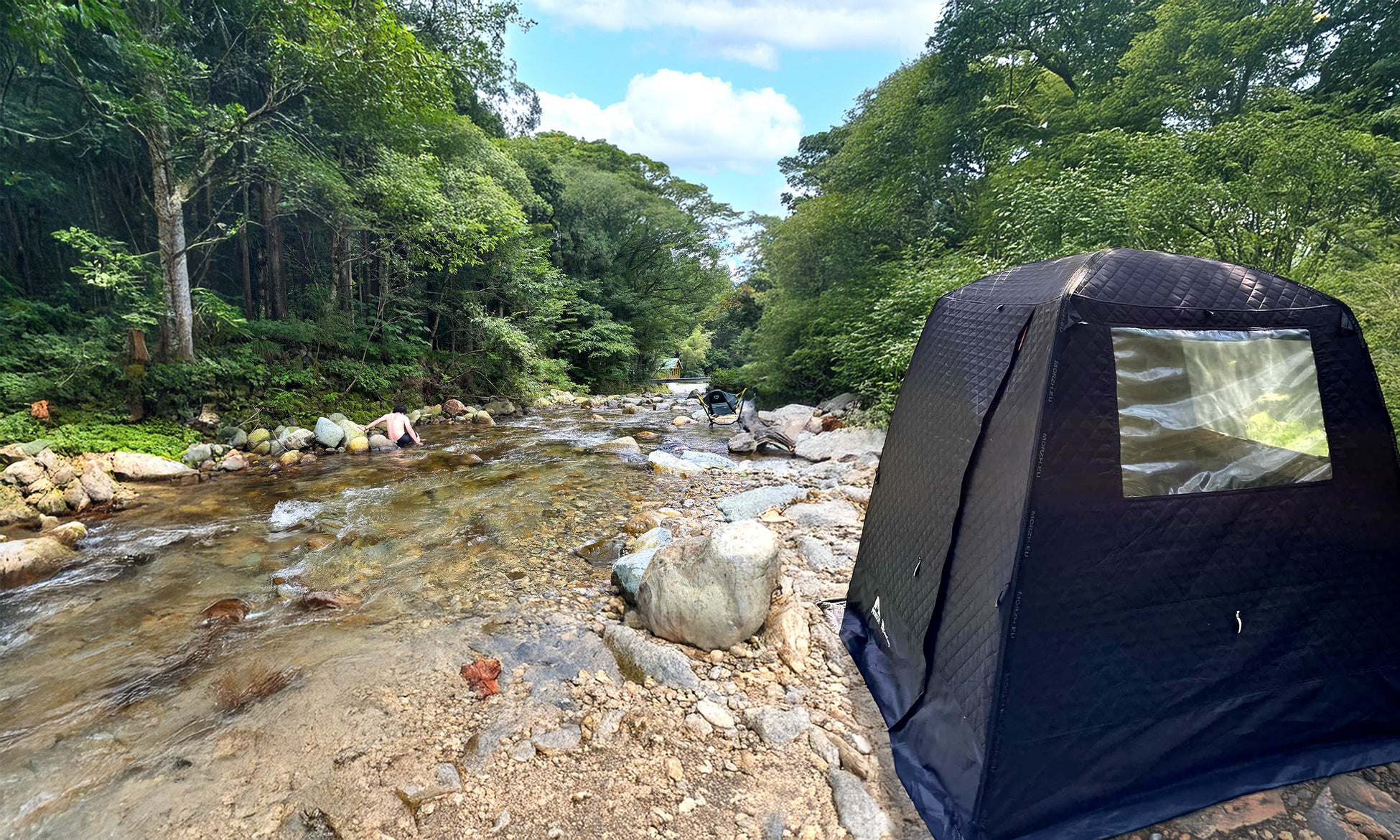モリノネカワノネの川辺に体験無料のテントサウナが登場。しっかり身体をあたためたら、そのまま川へダイブ!自然のなかでととのう体験をお楽しみいただけます。