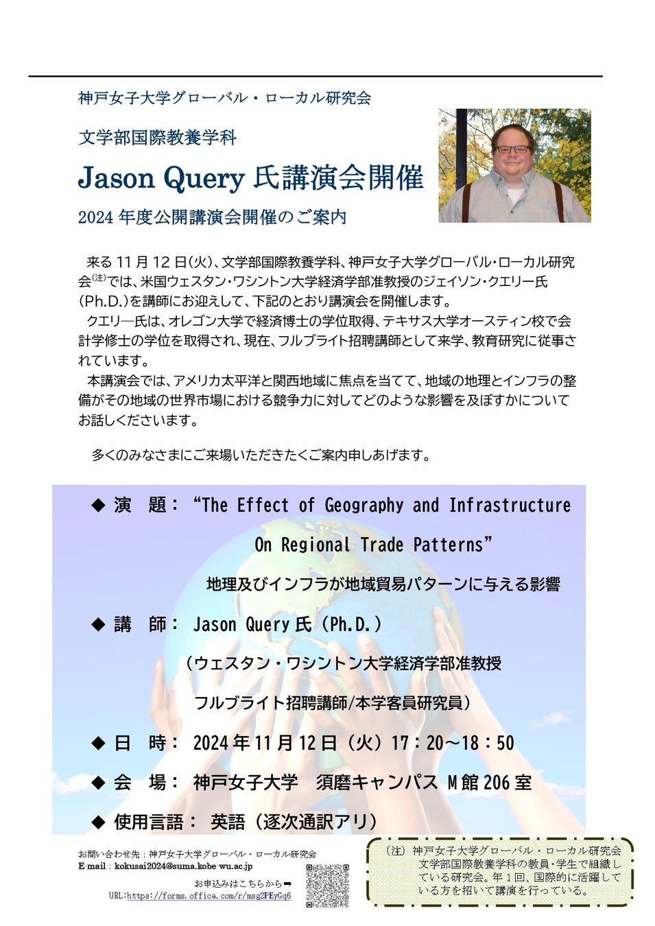 神戸女子大学文学部国際教養学科は、経済学をご専門とされるJason Query氏(Ph.D.)を招き、特別講演を開催することをお知らせいたします。この講演は、2024年11月12日(火)須磨キャンパスにて行われ、グローバル化と地域性の交差点における新たな視点を提供します。