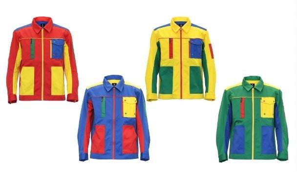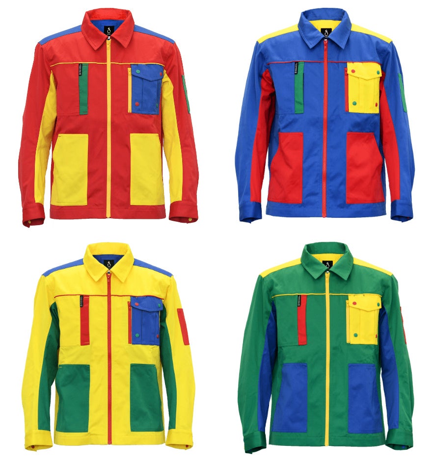 ブロックのように並べられたカラフルな生地の切り返しが、働く人のアイデア、無限の可能性による創造力と好奇心を加速させるデザイン。用途に応じた機能的な6箇所のポケット。安全面と着やすさを両立したボタンとファスナー仕上げ。工場で働く人の声とこだわりが詰まったワークジャケットの完成です。