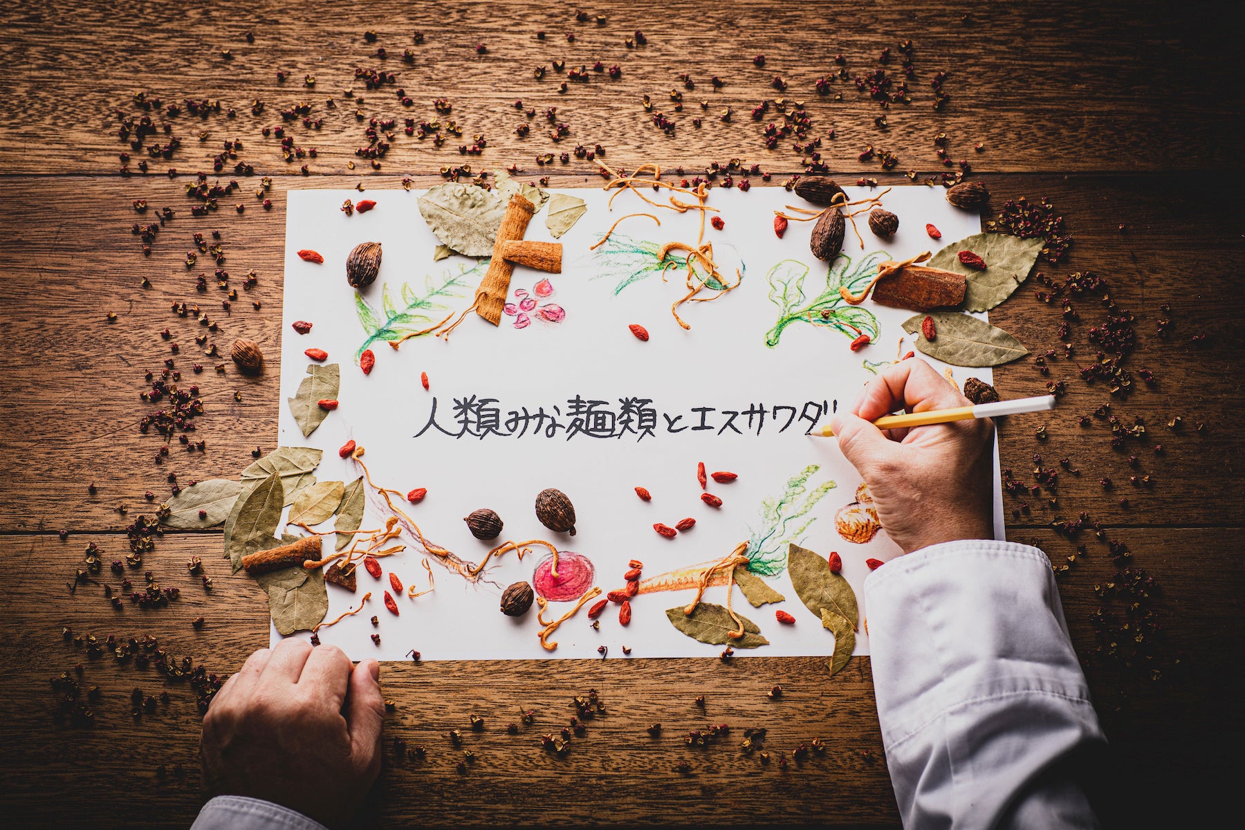「人類みな麺類とエスサワダ」で提供するラーメンは、大阪行列No.1ラーメン店「人類みな麺類」の醤油ラーメンをベースに、澤田シェフが独自のスパイスを調合したこれまでに無い新感覚の「薬膳ラーメン」を提供いたします。使用するラーメン鉢もこだわり、陶芸家 玉山弘季(陶芸工房 Tama atelier 代表)が作り上げました。テーマは"バキバキ"で、破壊と想像を繰り返し薬膳ラーメンとの調和を目指した究極の陶器です。