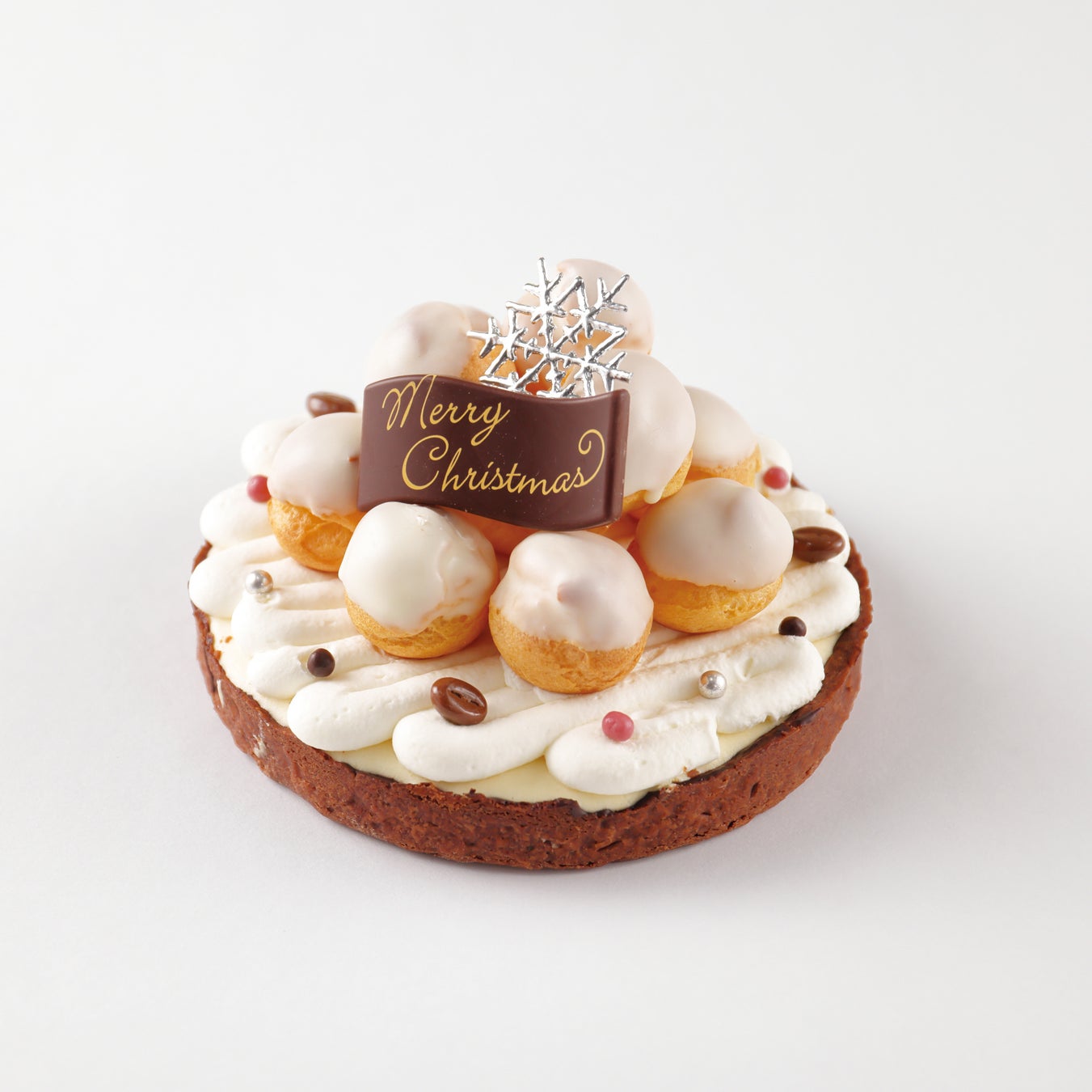 ココア風味のパートシュクレ生地に、エスプレッソを染み込ませた芋入りスポンジを敷き、ティラミスクリームをたっぷりのせました。その上には金時クリームとむらさき芋クリーム、2種類のプチシュークリームを積み重ねクロカンブッシュに。コーヒーのほろ苦さと、お芋の甘さを同時に味わえる贅沢なケーキです。