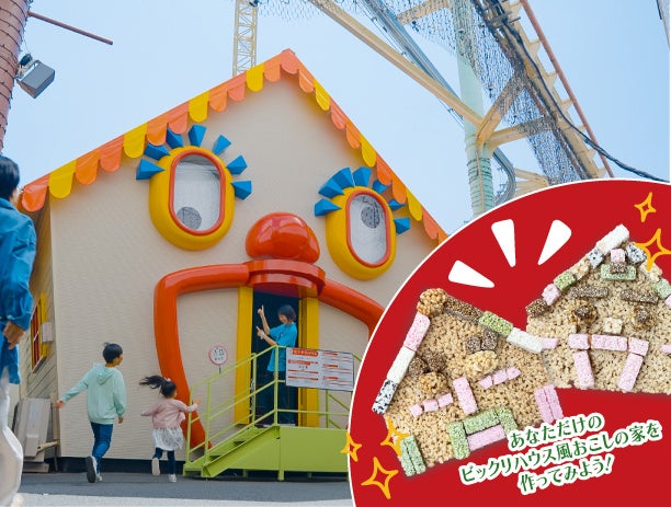 常盤堂雷おこし本舗『雷5656会館』で、花やしき現存最古のアトラクションを模した 「ビックリハウス風おこしの家」を製造体験できるワークショップと、花やしきののりもの1回券がセットになった、特別入園チケットを販売します。食べられるビックリハウスを作った後は、花やしきでビックリハウスに乗ってお楽しみください。