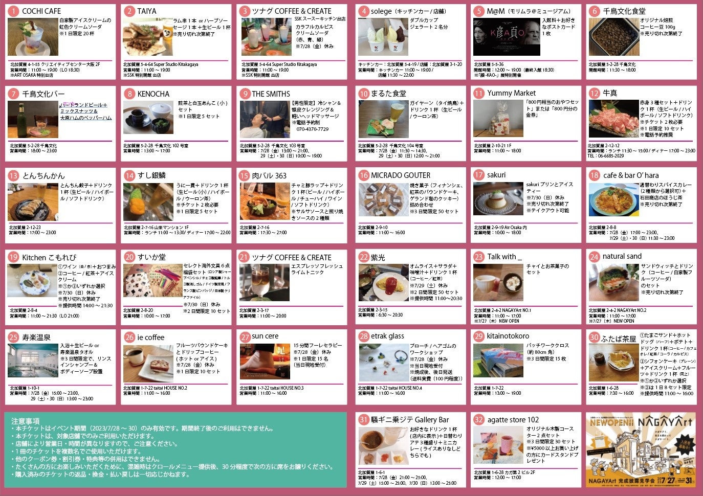 参加店舗:北加賀屋エリアのカフェ、居酒店、雑貨屋、マッサージ、ワークショップ、銭湯など32店舗