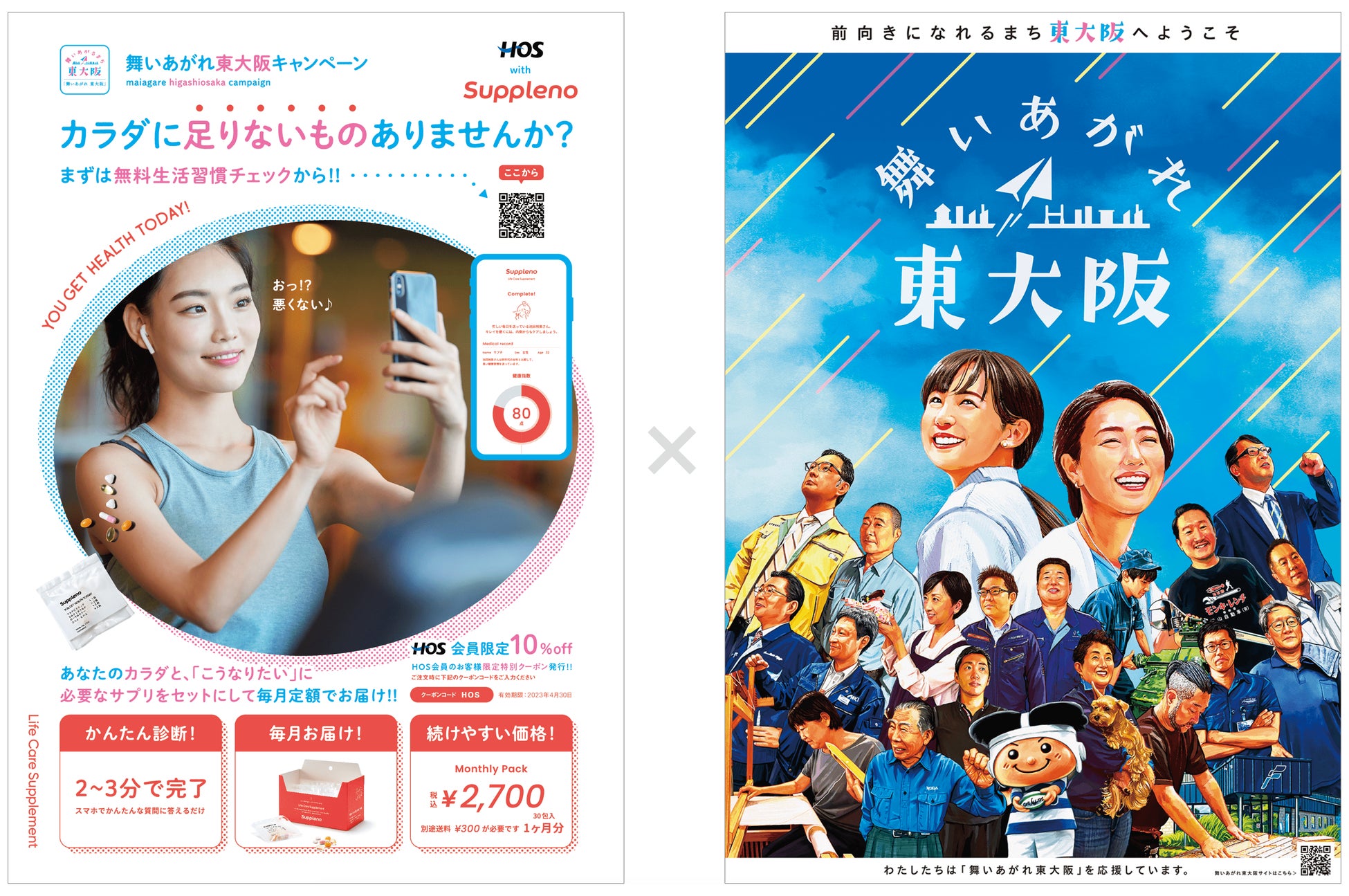 株式会社SupplenoとHOS株式会社は、共に東大阪市に本社を置く企業です。株式会社Supplenoはサプリメントの提供を通してカラダの中から、HOS株式会社はフィットネスや運動施設の運営を通してカラダづくりから、健康をサポートする事業を行っています。今回、東大阪市が推進する「舞いあがれ 東大阪」プロジェクトの「前向きになれるまち、東大阪からもっと元気に」という主旨に賛同し、健康面から元気を応援するキャンペーンを共同で実施する運びとなりました。