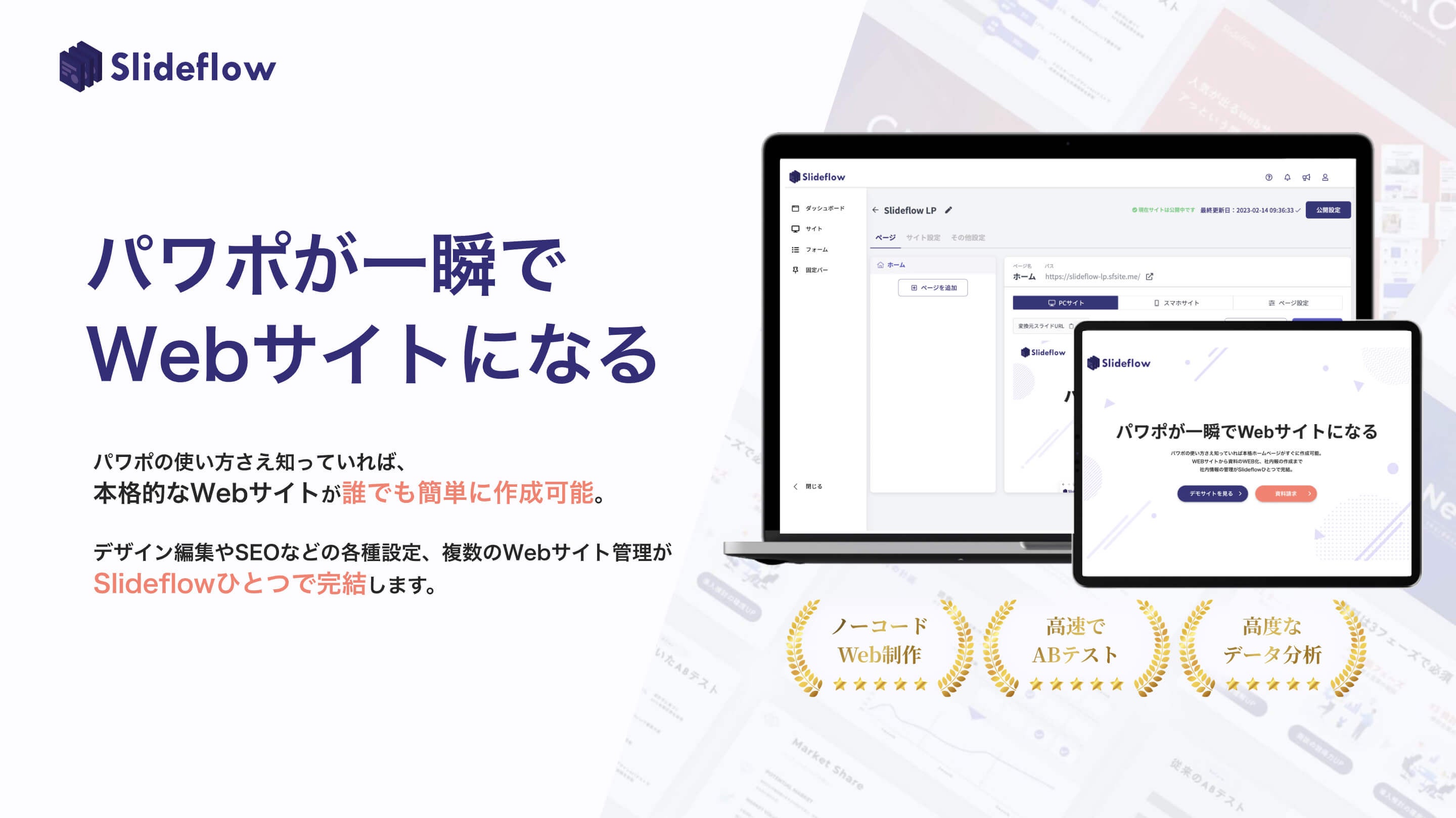 Slideflow(スライドフロー)は、プログラミングなどの専門知識がなくても「PowerPoint」や「Googleスライド」で作成したデータを使えば、誰でもWebサイトを制作することができるWebサイト制作サービスです。スライドをアップロードしてから最短30秒でウェブサイトに変換でき、高度なサイト運用までを一貫して行うことができる世界初のSaaSです。