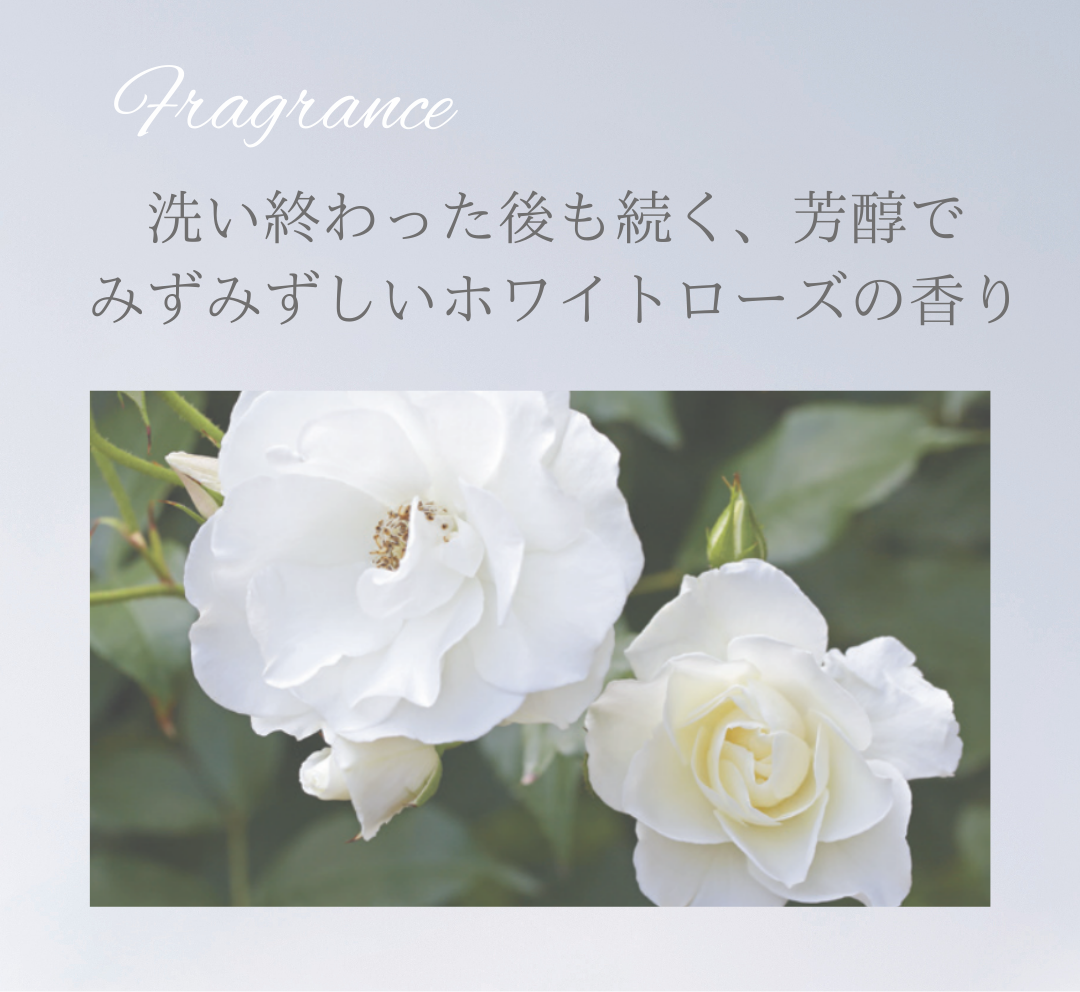 天然アナツバメの巣エキスが手肌をしっかり洗浄しながらも優しくケアし、なめらかな心地よい洗い上がりの肌を実現。約200種もの種類の中から厳選した天然由来の7種のハーブエキス(チャ葉エキス、オウゴン根エキス、イタドリ根エキス、ツボクサエキス、カンゾウ根エキス、ローズマリー葉エキス、カミツレ花エキス)も調合し、芳醇でみずみずしいホワイトローズが癒しのひとときへと導きます。