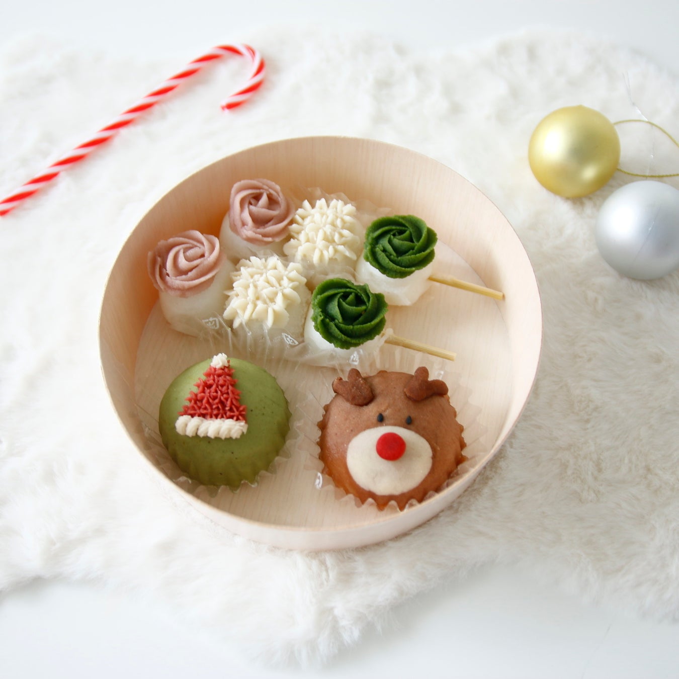 トナカイ(カカオオレンジ)、サンタ帽(ピスタチオ餡と苺)と団子をセットにした