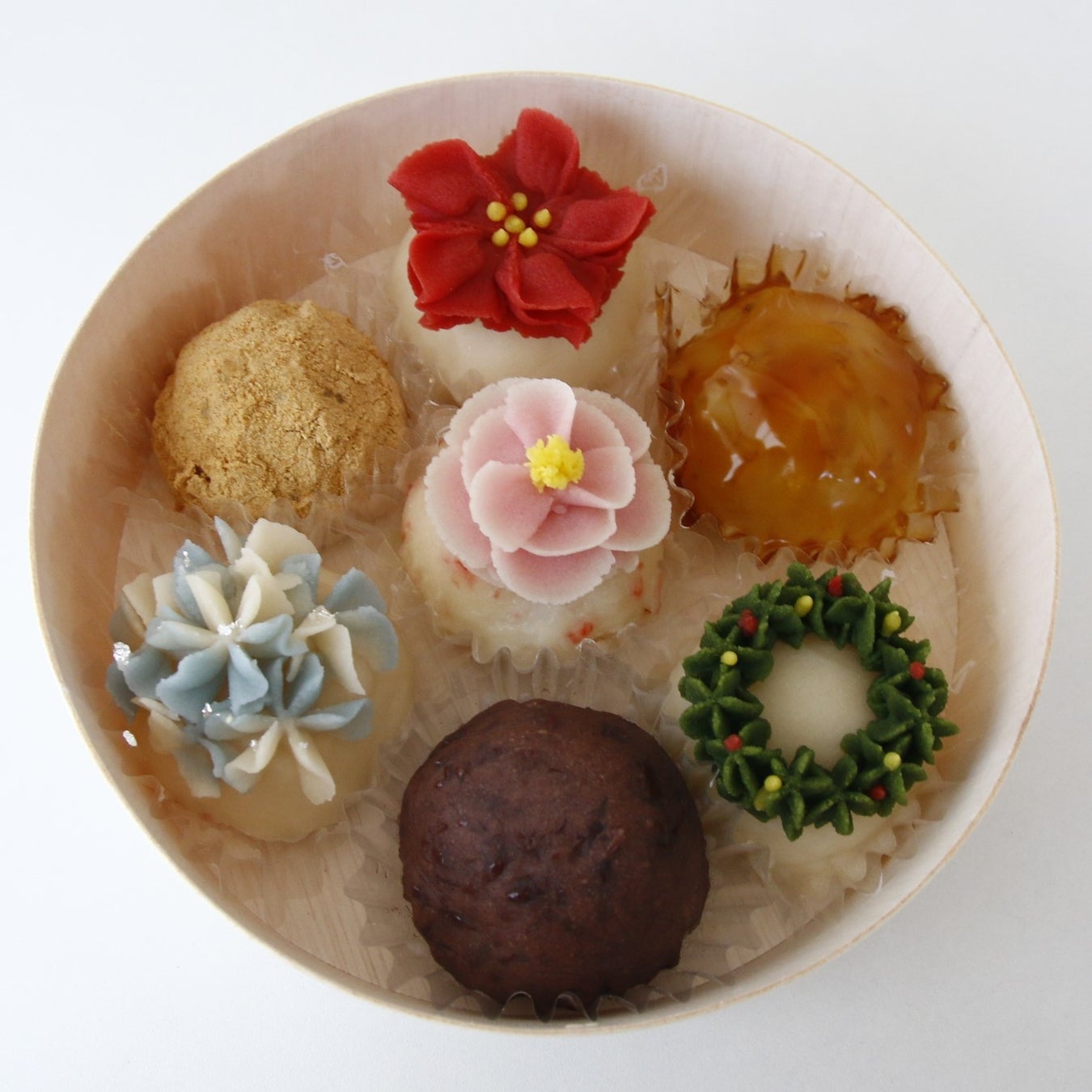 12月限定のギフトボックスは、冬の季節感を詰め込んだ特別なおはぎです。ポインセチア(カシスピューレ入り)、リース(抹茶餡)、寒椿(ホワイトチョコ餡といちご)、初雪(ゆず風味白餡・銀箔飾り)、みたらし(胡桃餡とみたらしあん)などがセットになっています。贈り物にもご自宅用にもおすすめです。