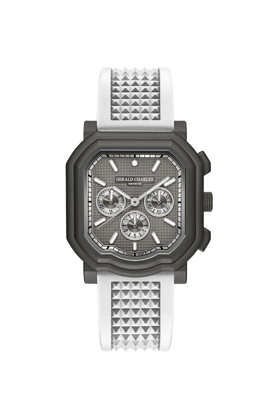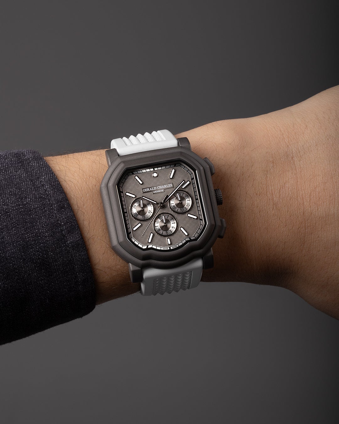 最初のマエストロ3.0 クロノグラフ グレーは、ダークブラスト(Darkblast®)加工を施したグレード5チタンケースに、洗練されたグレーの文字盤とホワイトのバルカナイズドラバーストラップを組み合わせ、ブランドのシグネチャーであるミニ・タピスリーパターンがアクセントを添えています。