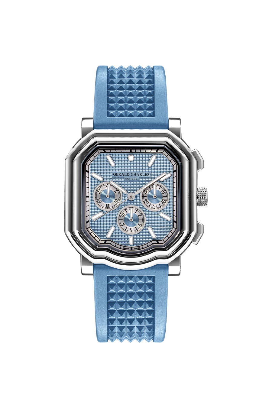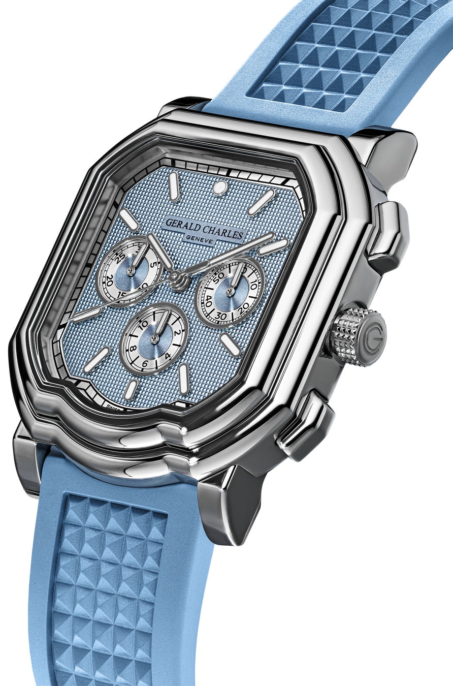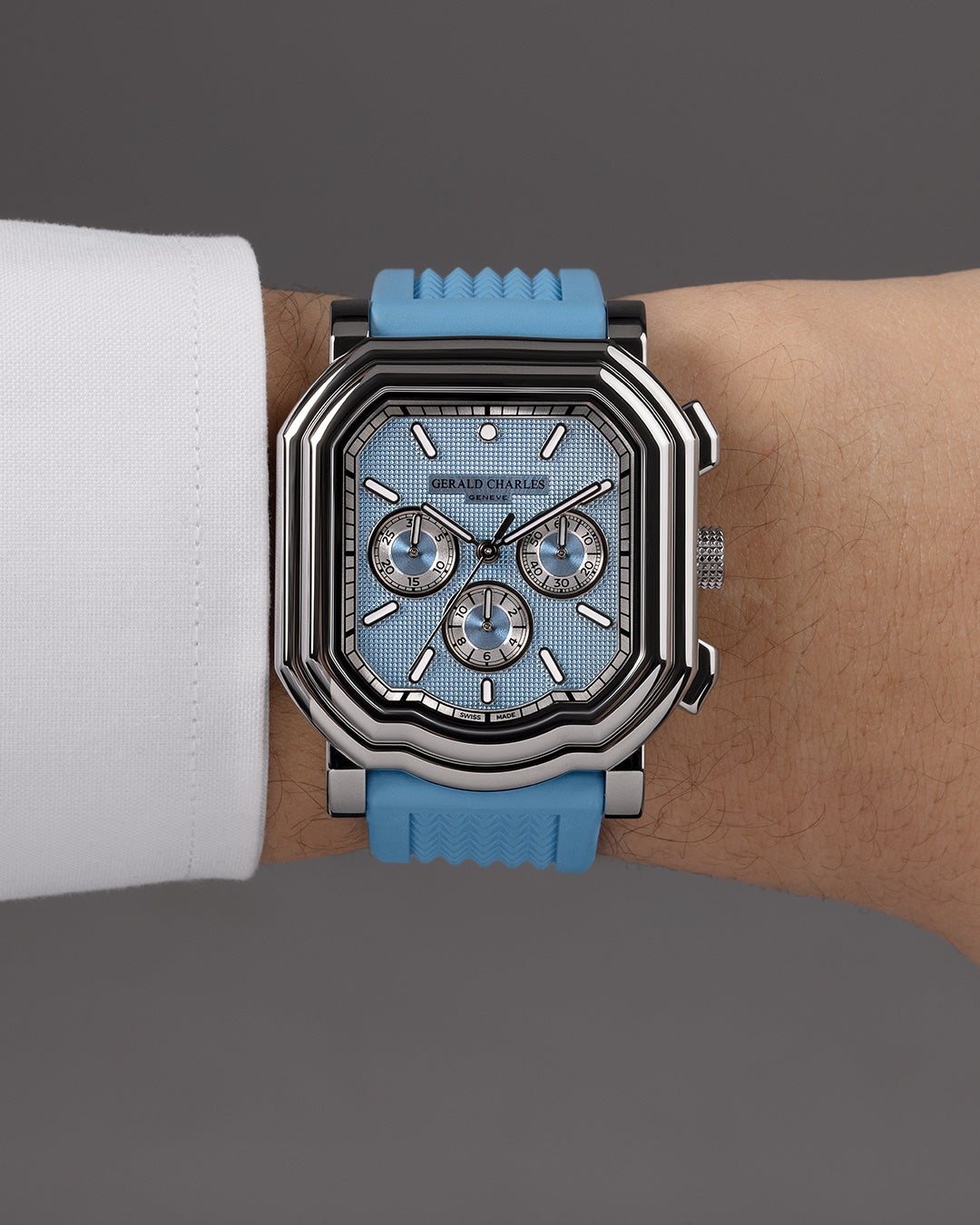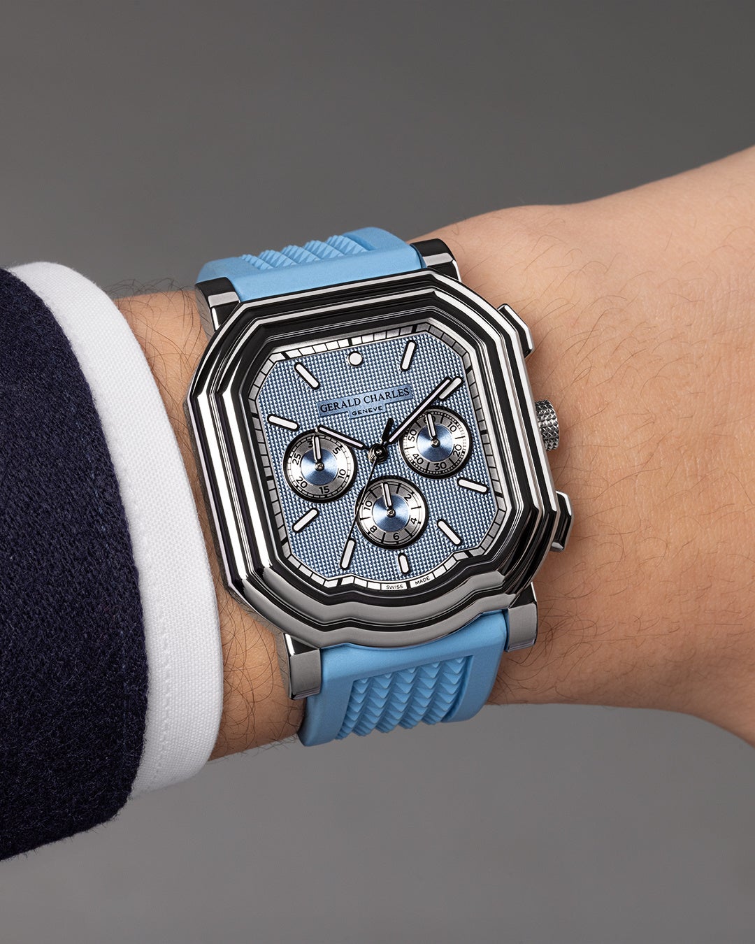 チタン製ケースのアンスラサイト仕上げは、ダークブラスト(Darkblast®)加工という独自のパウダーを用いたサンドブラスト技術によって実現されたもので、ソフトでベルベットのような色合いを醸し出しながら、耐傷性を高め、大胆な存在感を維持します。さらに、ステンレススティールバージョンに施されたアイスブルーのアクセントは、ジェンタ氏の色彩への愛情へのオマージュであり、デザインに遊び心と洗練されたひねりを加えています。