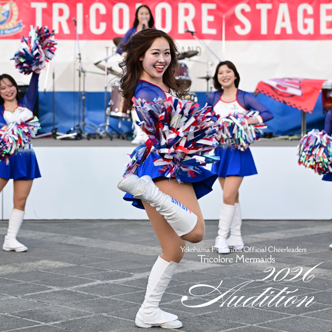 横浜F・マリノスオフィシャルチアリーダーズ Tricolore Mermaids 2026シーズンチアリーダーを募集します。横浜F・マリノスを愛し、ホームタウンを愛し、“誰かを笑顔にする力”を信じて活動するTricolore Mermaids。次のシーズン、あなたの情熱をスタジアムで輝かせませんか?