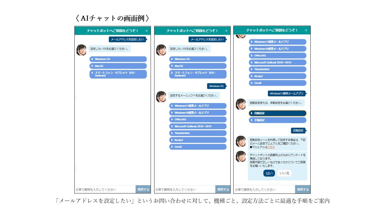 お客様の困りごとをより即時解決できるよう、FNJは電話やメールだけでなく、AIチャットによるサポートの拡充も図っています。FNJが20年以上にわたりインターネットサービスのカスタマーサポートを提供するなかで培った知見を活用し、詳しいヒアリングが必要なお問い合わせに関しても、お客様の要望や課題を的確に理解し、最適な解決手段を案内できるようAIの精度向上を進めてきました。その結果、多くの問い合わせがAIチャット内で即時解決できるようになり、AIチャットの利用数も大幅に増加しています。