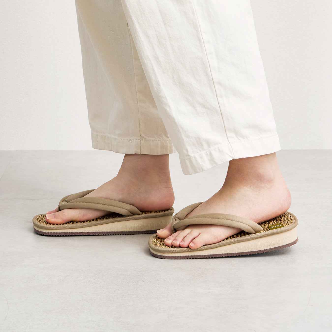 硬めでざっくりとした風合いと、い縄を編み込んだ凹凸が足裏にほどよい刺激。肌に密着しないので、汗をかきやすい夏でもベタつかず、さらっと快適です。
